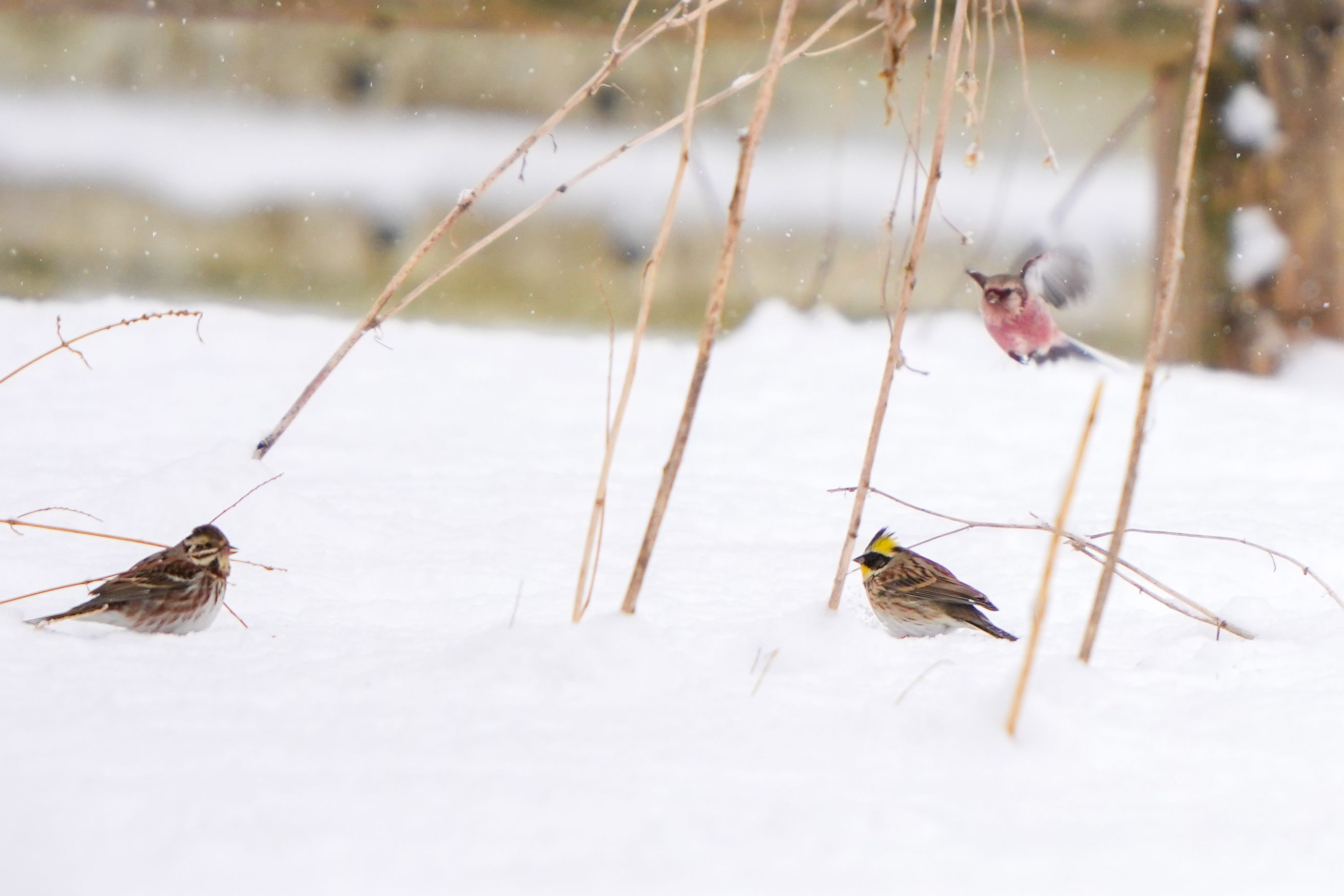 ミヤホさんと遊んでたら今季初(遅)のベニマシコさんが乱入してきました。写真としてはアレですが面白い画なのでアップしちゃいます^^;