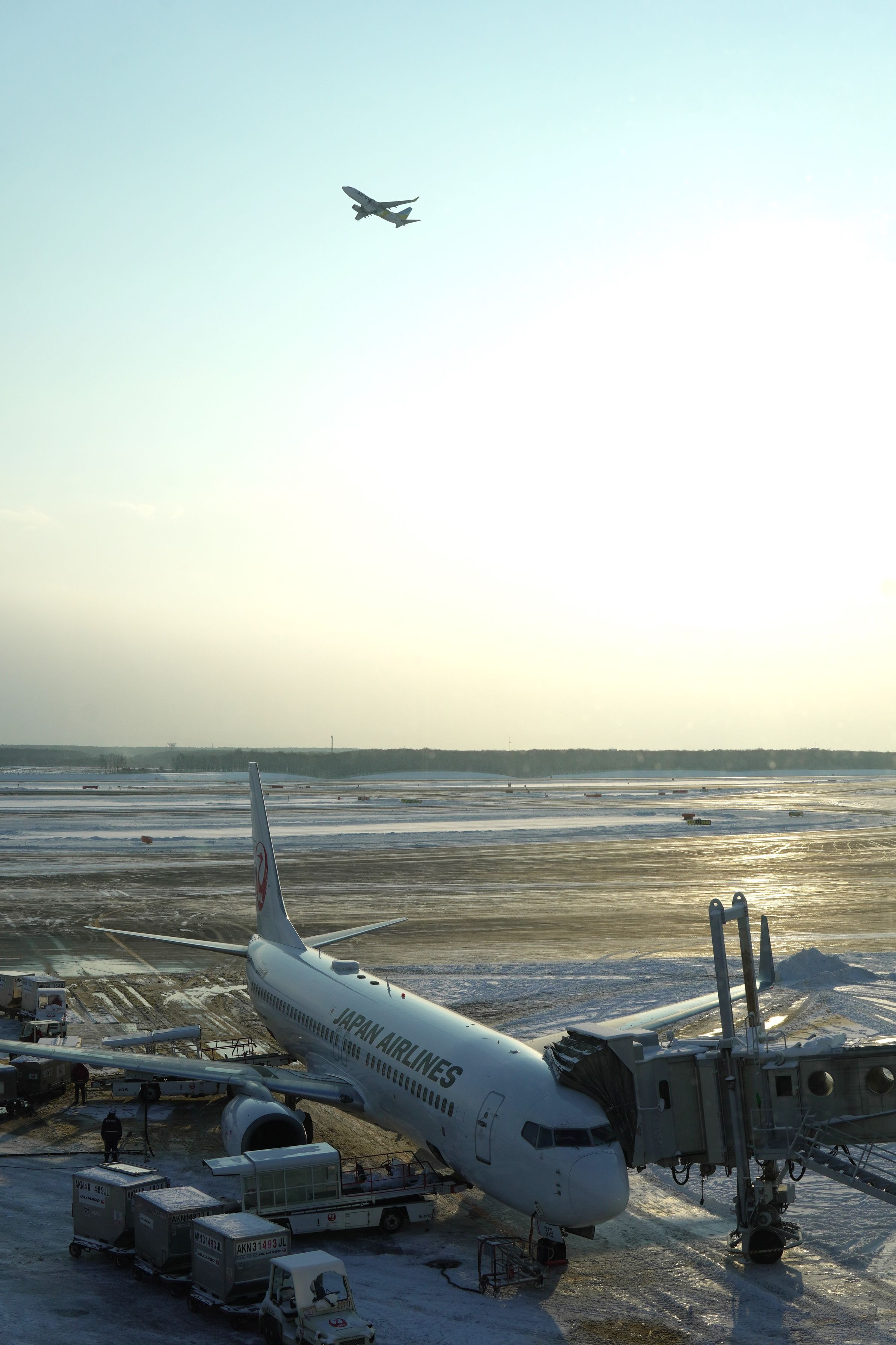 氷点下7度、凍結した滑走路とJAL機が朝日に輝いていました。新千歳空港は早朝から発着便でフル稼働。