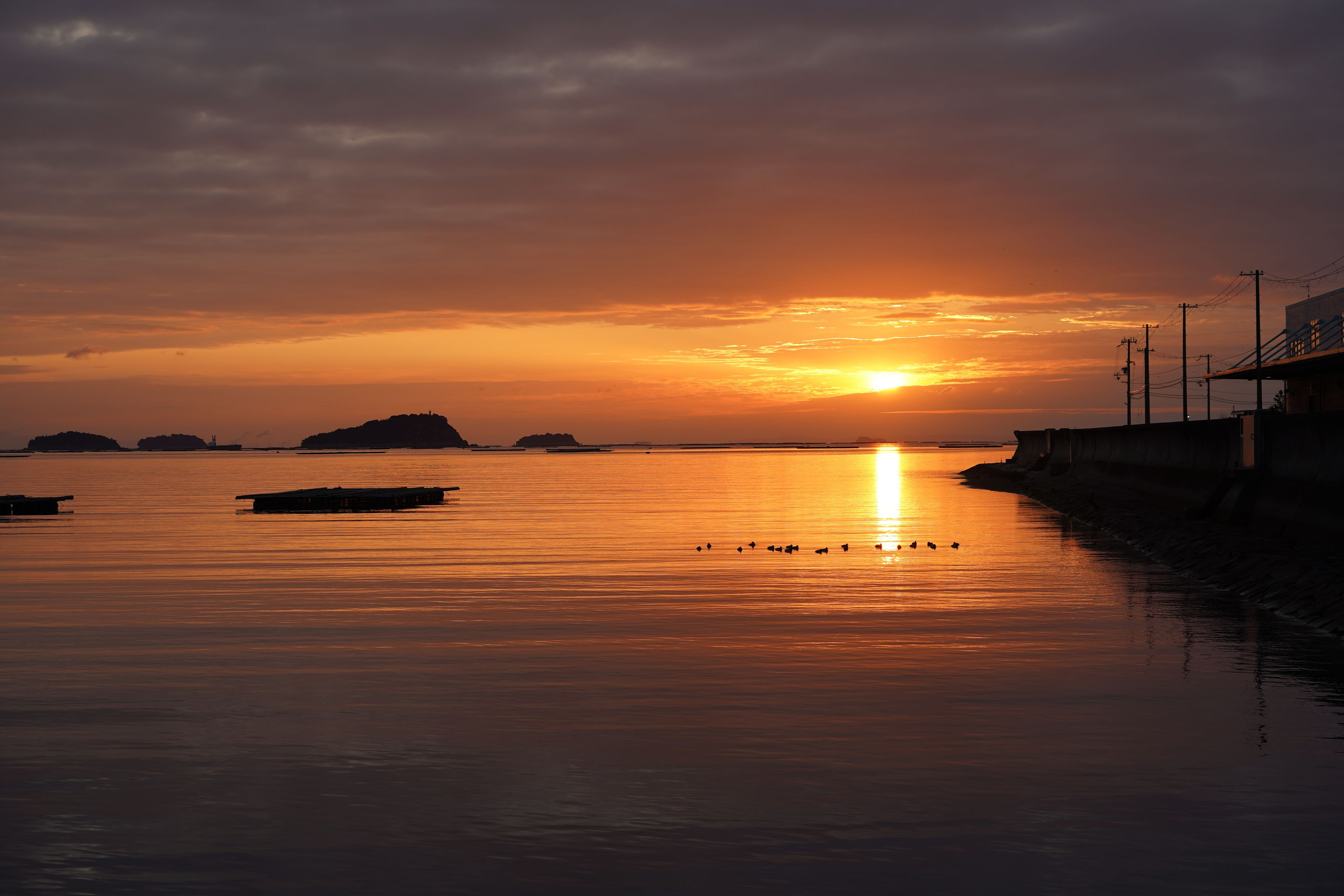 2月兵庫県赤穂市の夜明けです 水鳥が水面に漂っています