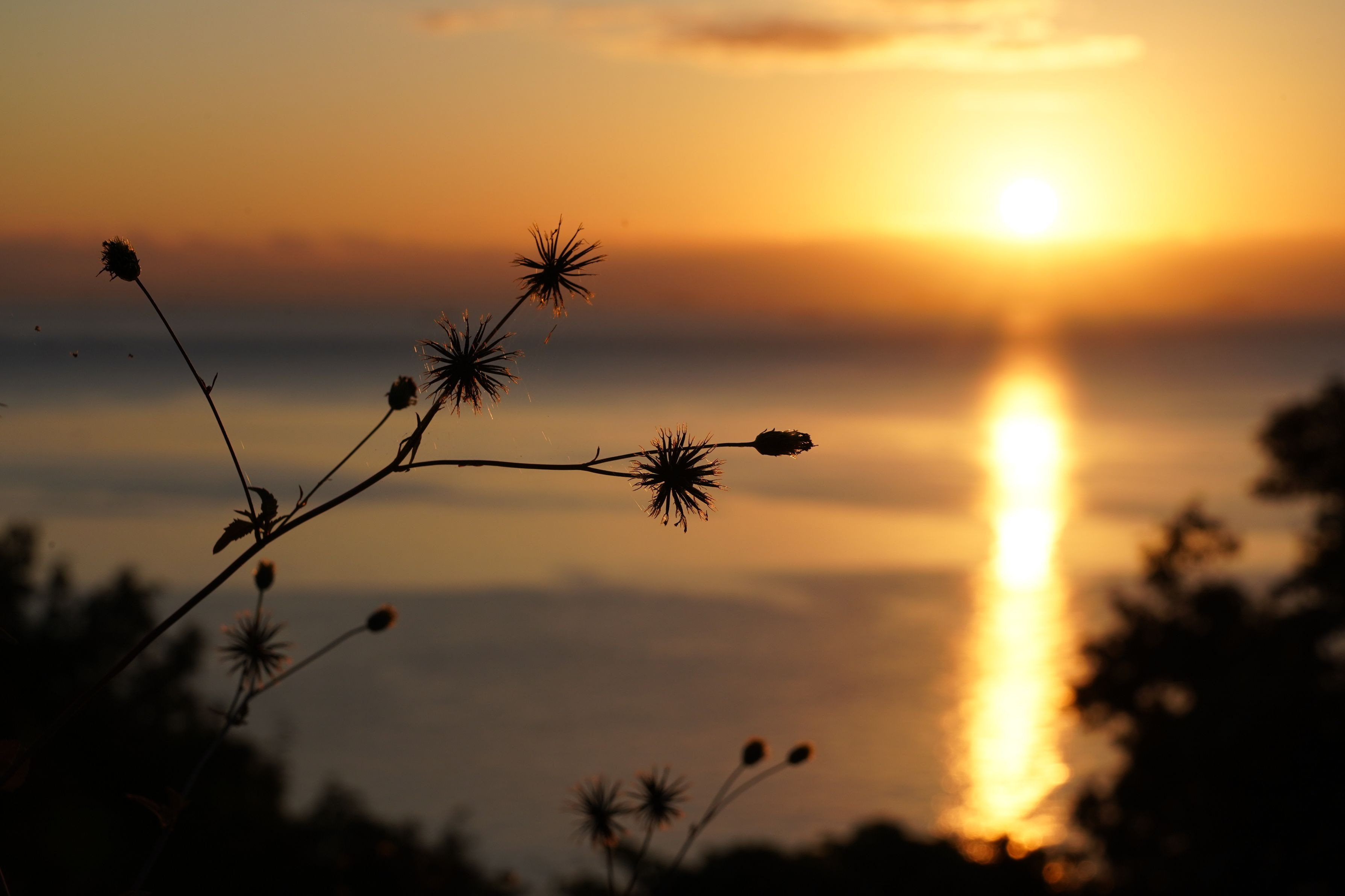 2023年10月兵庫県赤穂市の夜明けです 朝の光にセンダン草が映えてます