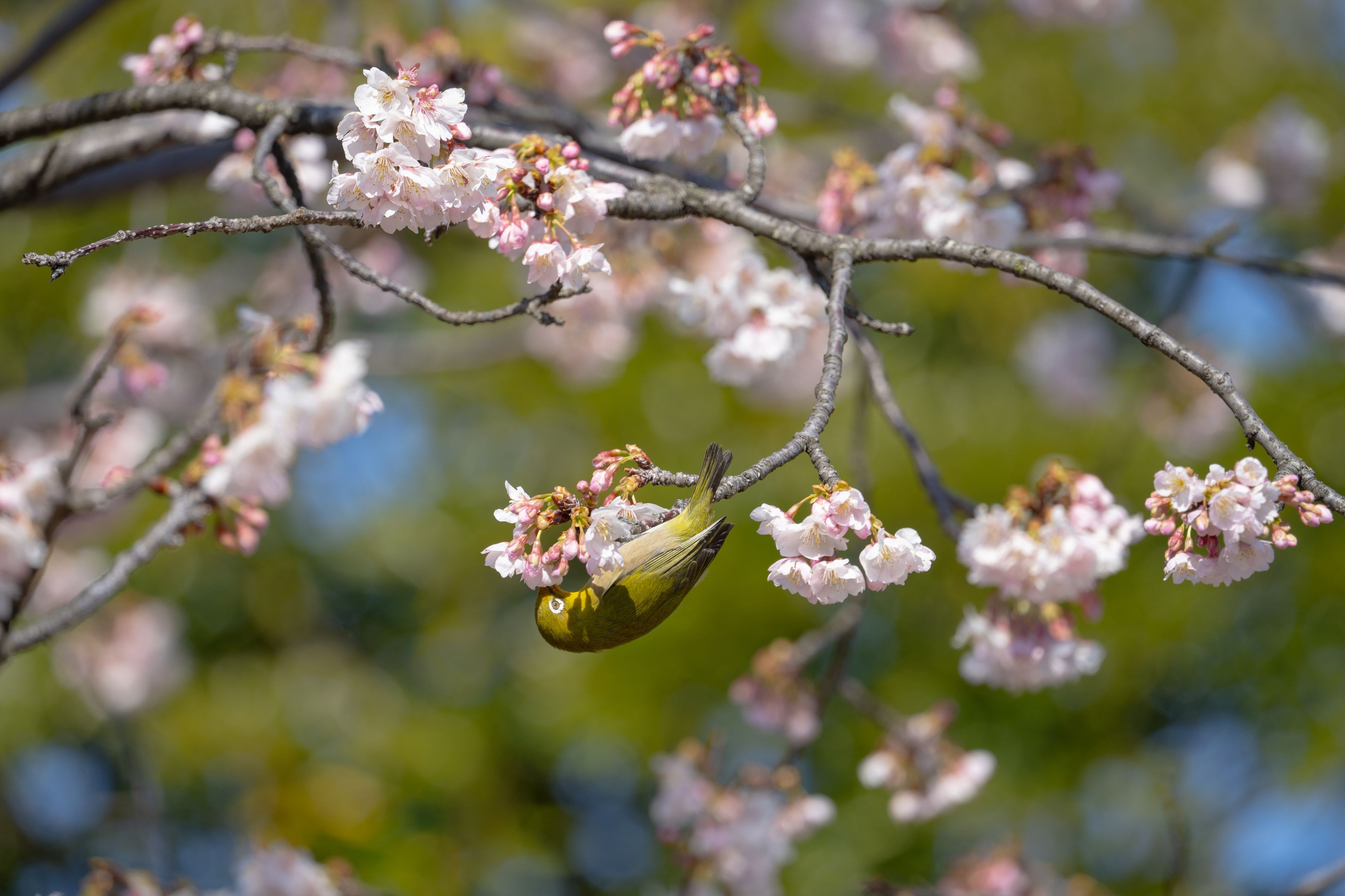 テーマパークのなかで桜が咲いてると見ていたらメジロに遭遇しました。