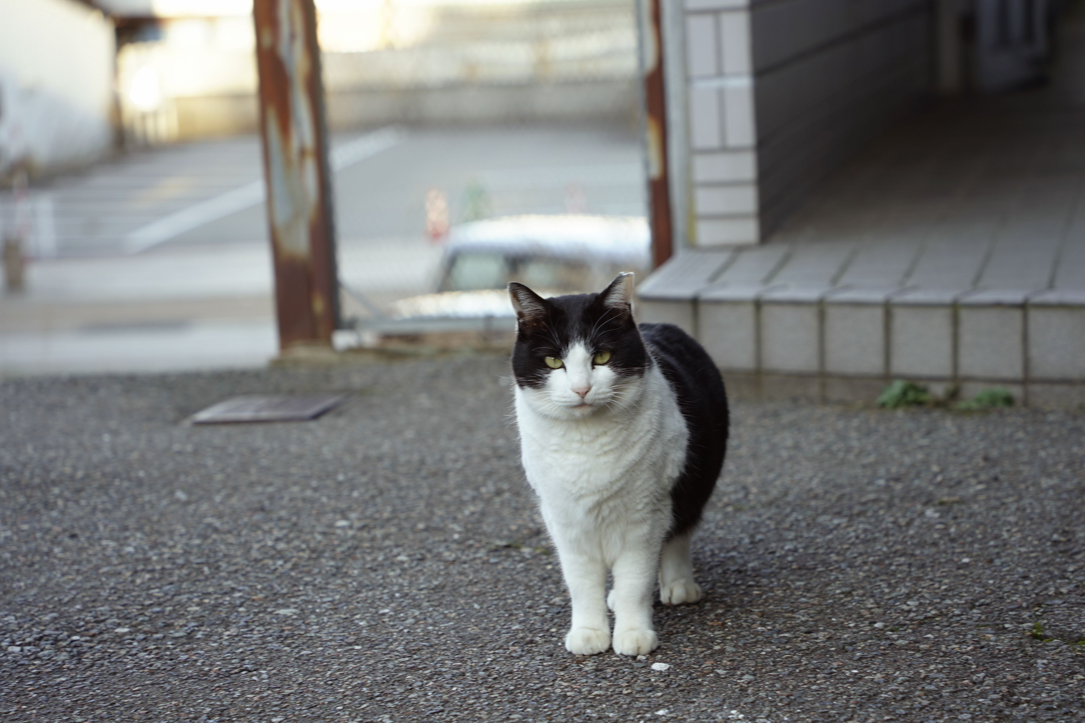 片山津温泉の一画にいた猫さんです。 石川県の片山津はかなり大きな温泉街ですが、今は廃業した所が多く、一部廃墟街となっていますね。だけど町には割と猫が多く、歩いていてとても楽しい場所です。