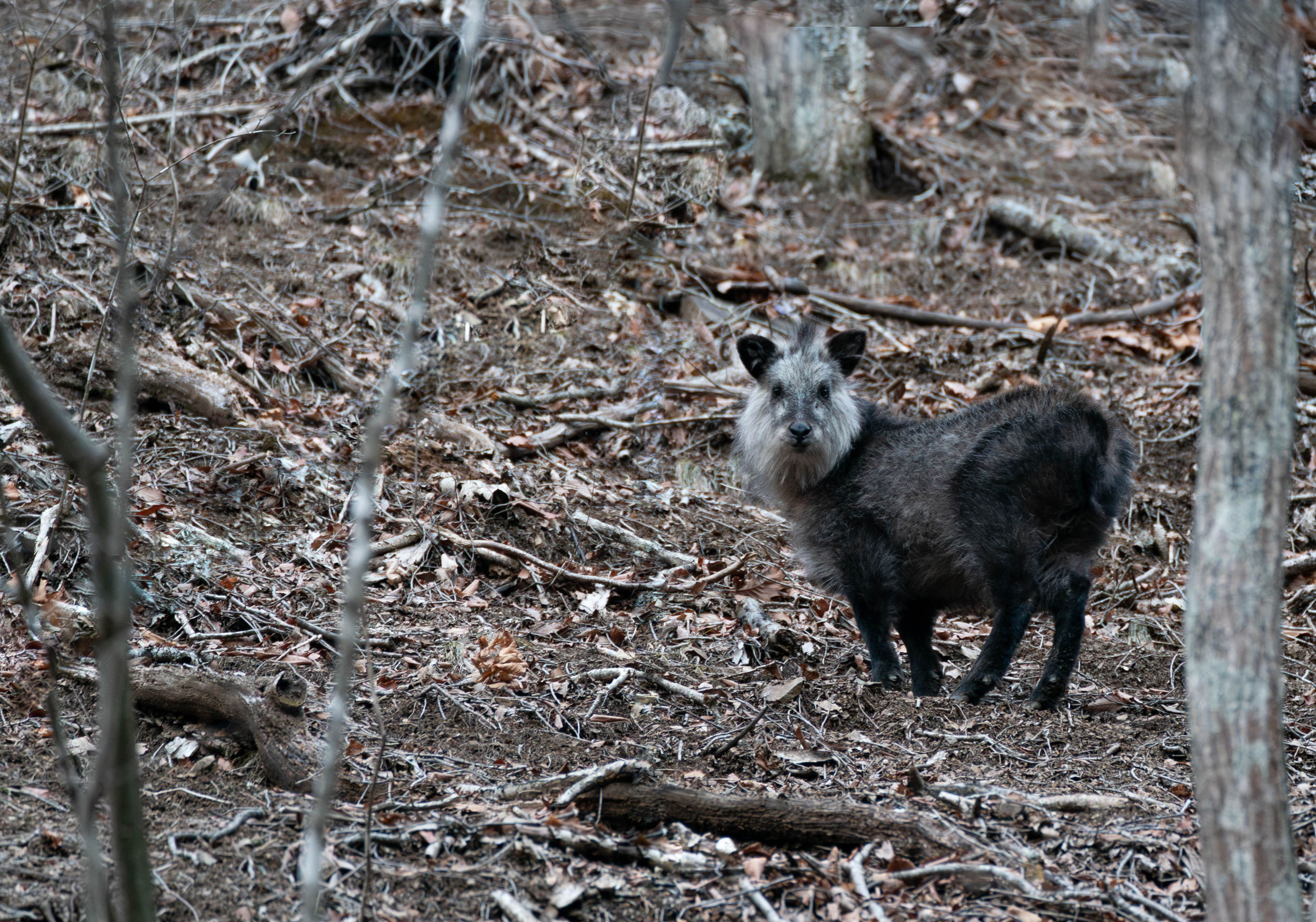 夕方、走行可能な残雪状況をチェック中、斜面を駆け上がる生物2頭見えた。 車を止め、カメラを手に付近を見ると1頭のカモシカがこちらを見ていた。 カモシカとの出会いは2回目、特別天然記念物としての保護政策で近年増加傾向だが、 興味深いのはウシやヤギ、シカの先祖、日本唯一のウシ科の動物で氷河期の生き残り。 もっとゆっくり見ていたかったが、崖を越え谷に消えて行った。