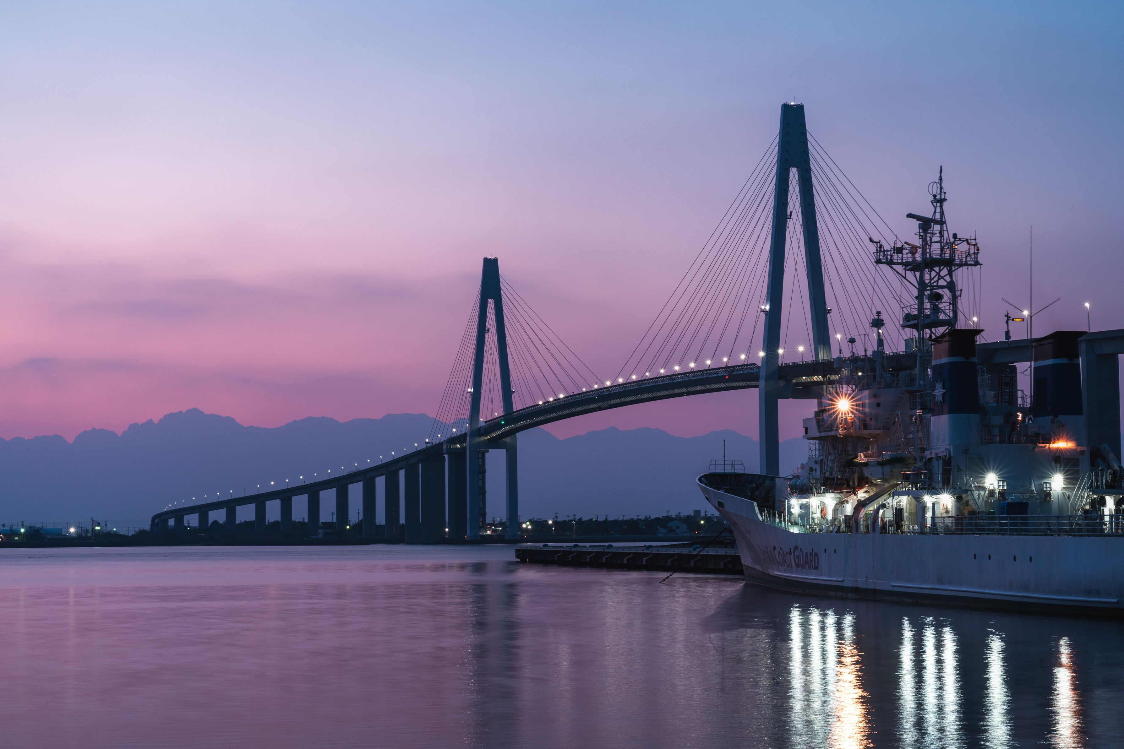 富山県で撮影した一枚。 船の進行方向、新湊大橋の先には立山連峰のシルエットが。 まだ明かりが消えない夜明け前の時間に撮りました。
