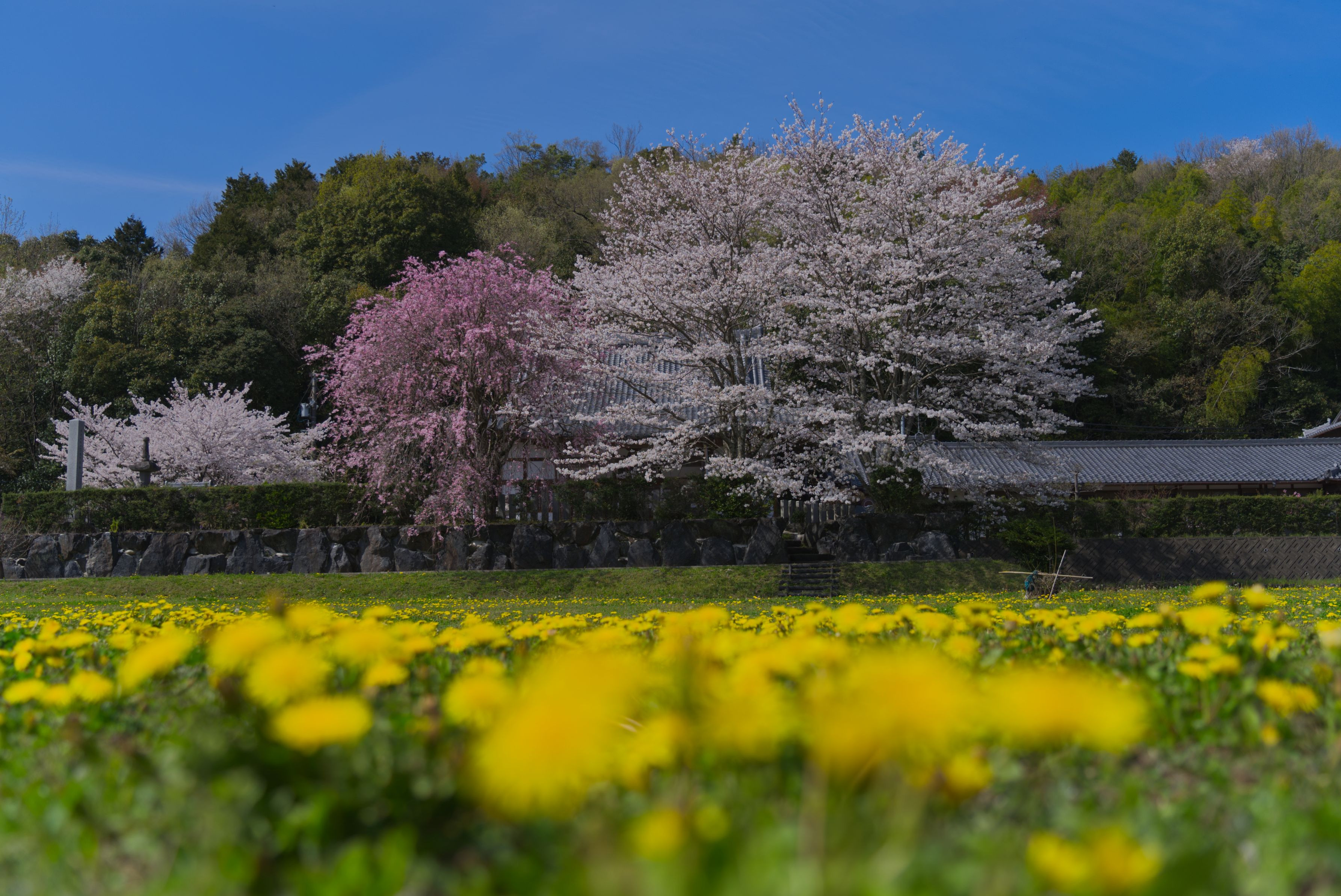 タンポポを前ぼかしして、後景の弥勒寺に咲く満開のサクラに焦点を合わせて、タンポポの黄色を前景と後景のサクラが春らしさを表現できたと思います