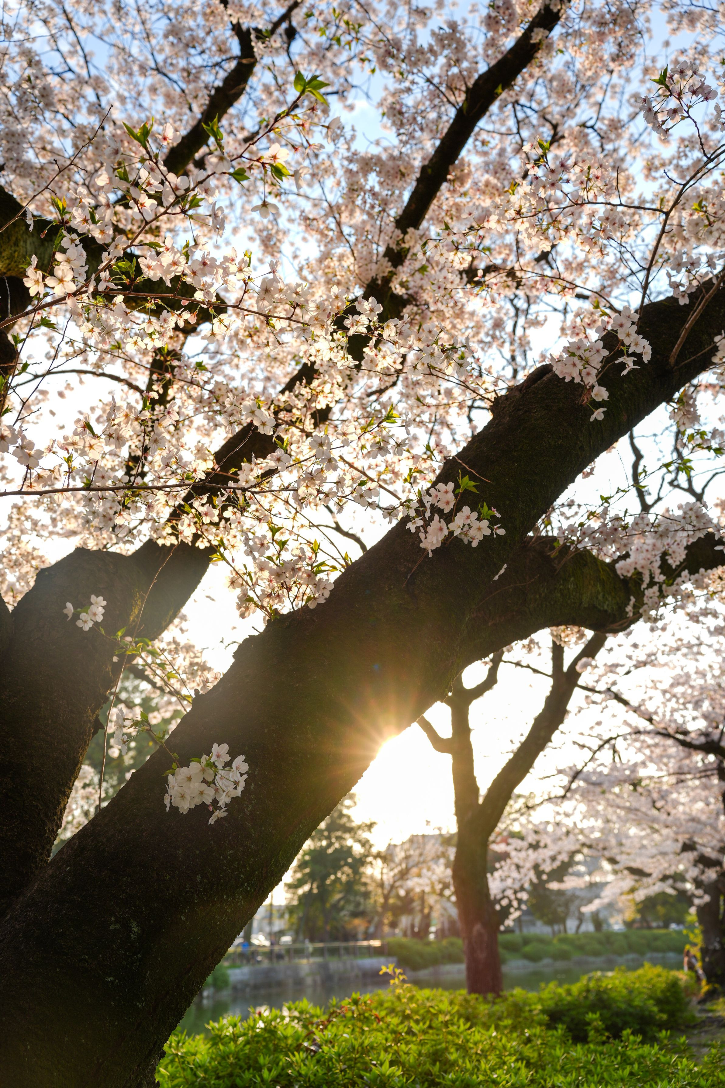 夕陽が綺麗で満開の桜と一緒に撮影しました。