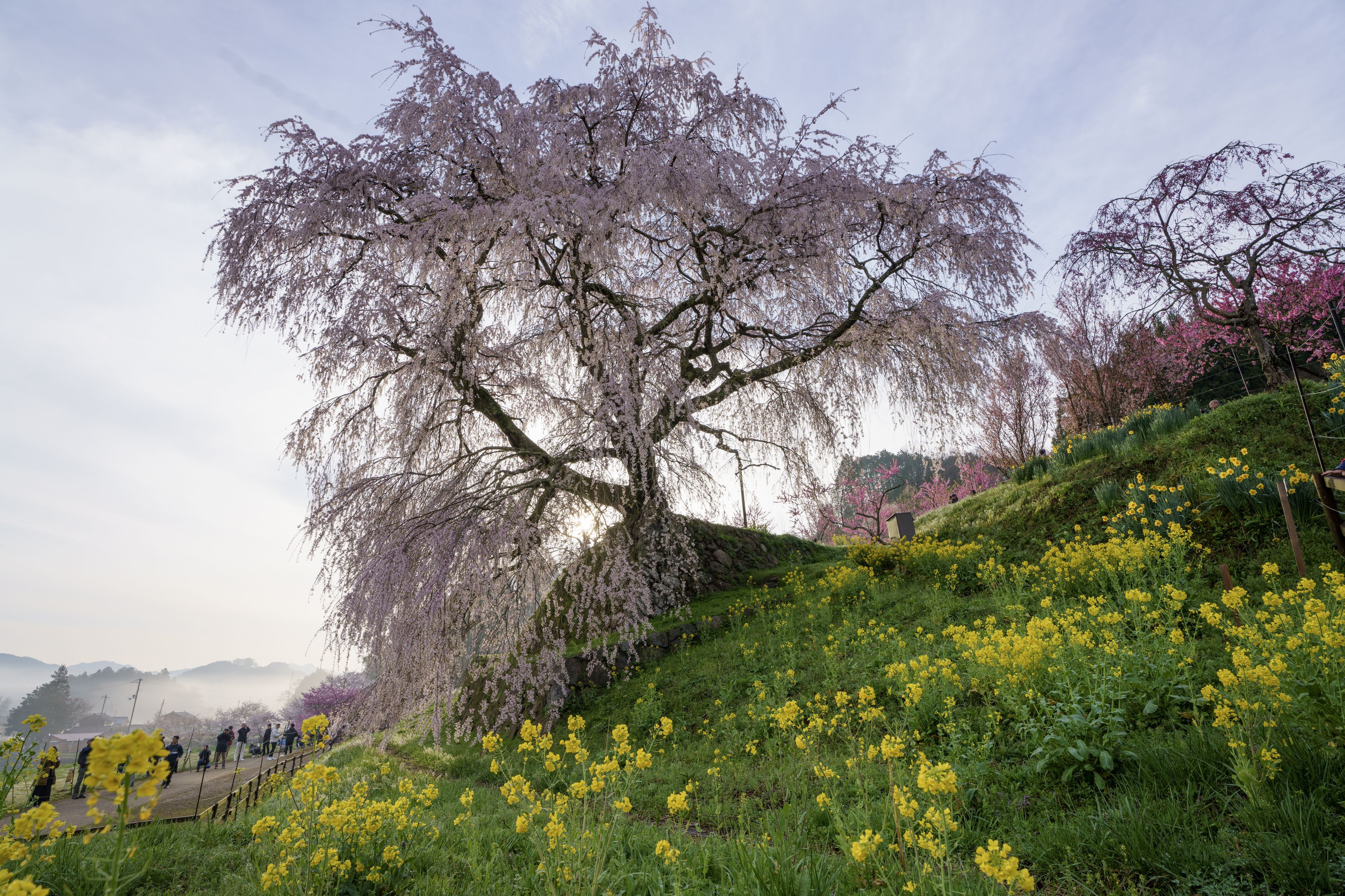 奈良県・又兵衛桜、バックに朝霞も入れながら。 圧倒的大きさを超広角レンズで捉えてみました。