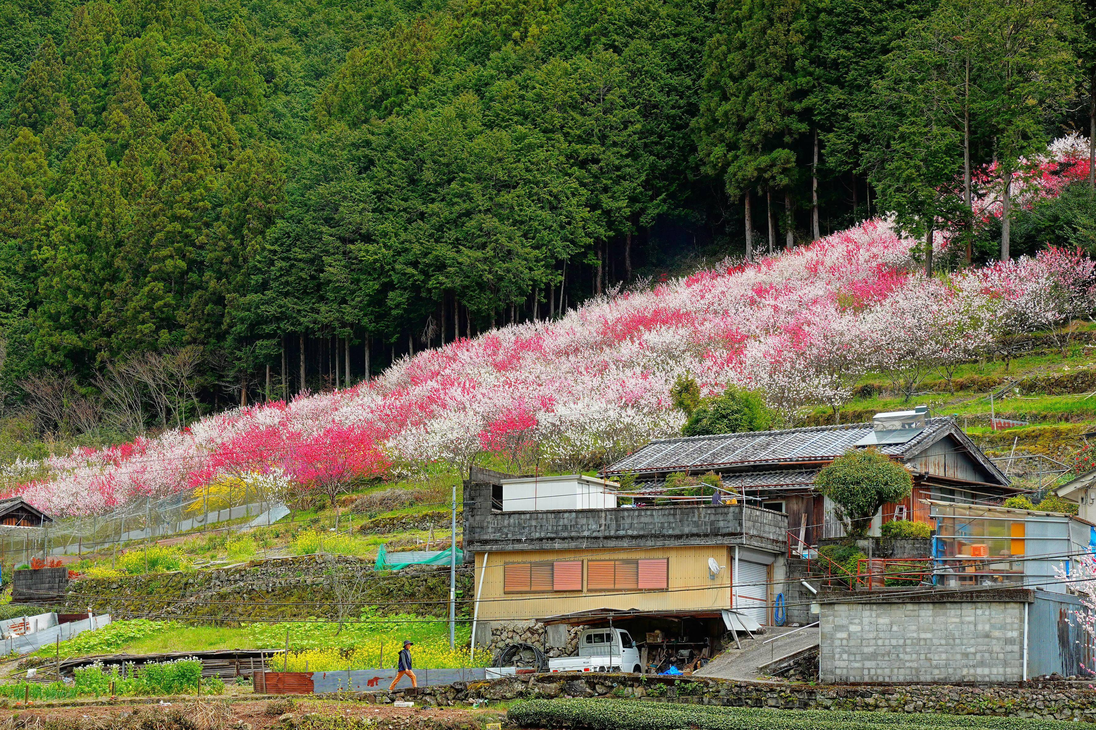 久喜の花桃 仁淀川町久喜地区にあり地区の新名所にと15年かけて植えてきた寒さに強い花桃。 上久喜の花桃への道中にあり、地元住民が大切に育てた桃の木に赤・白・ピンクの花が咲き乱れるその景色はまさに「桃源郷」と呼ぶにふさわしい。出典:仁淀ブルー観光協議会HP