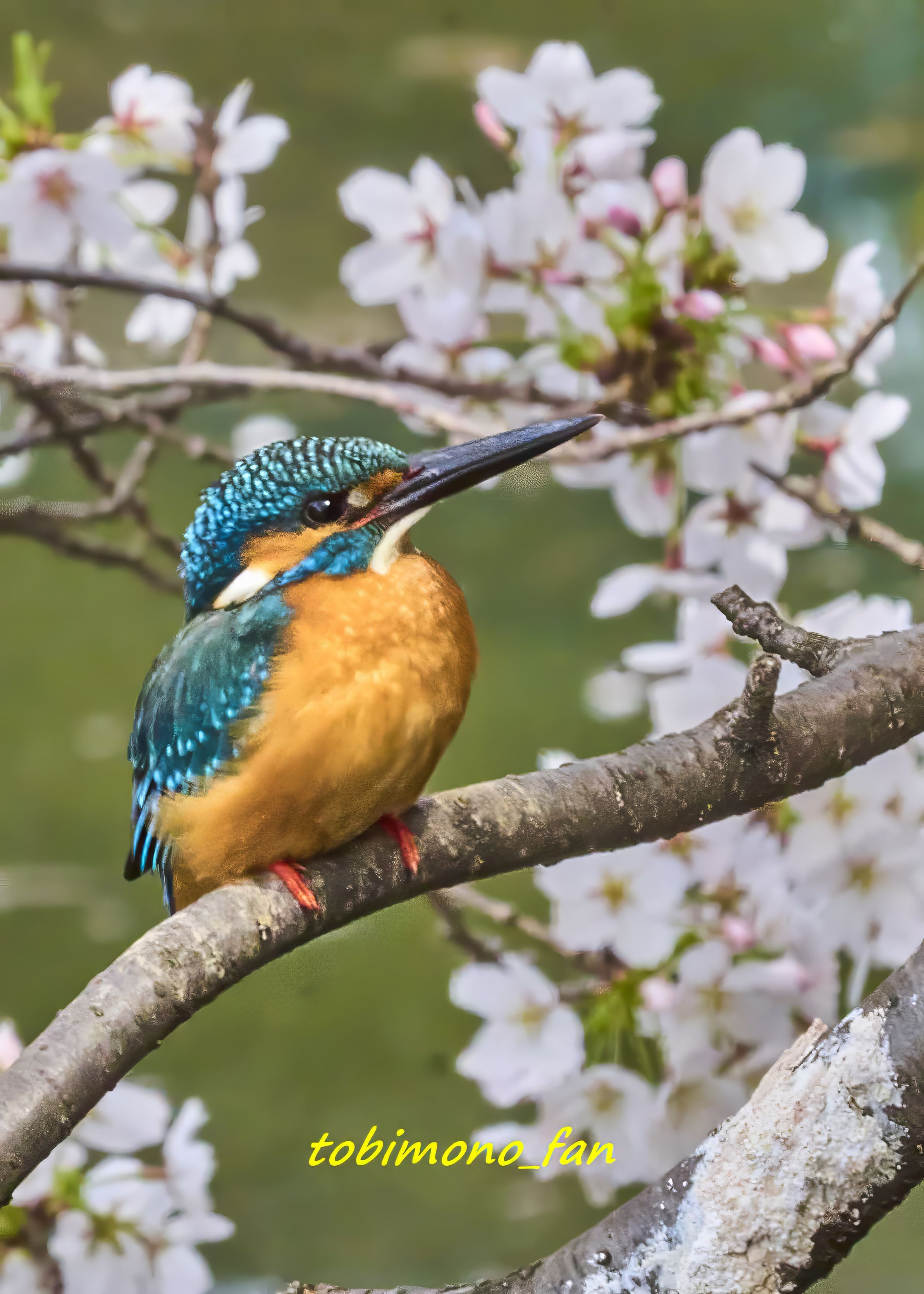 桜の花の前に止まったカワセミです。