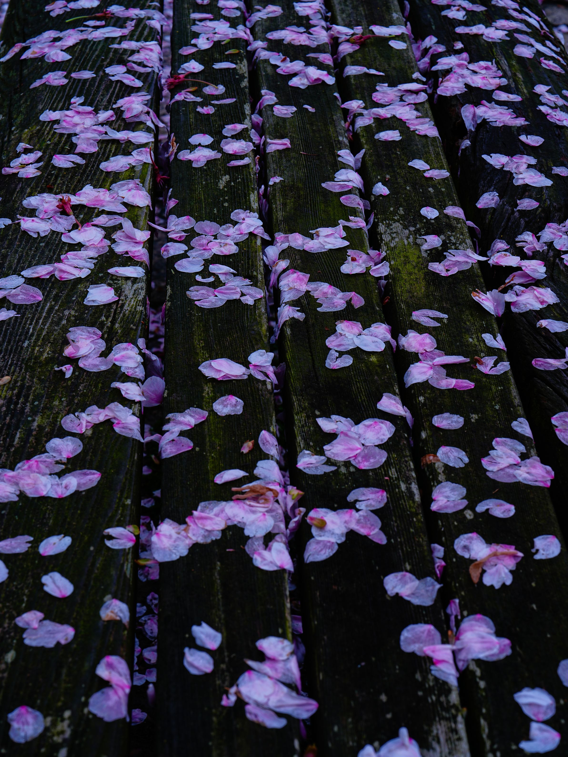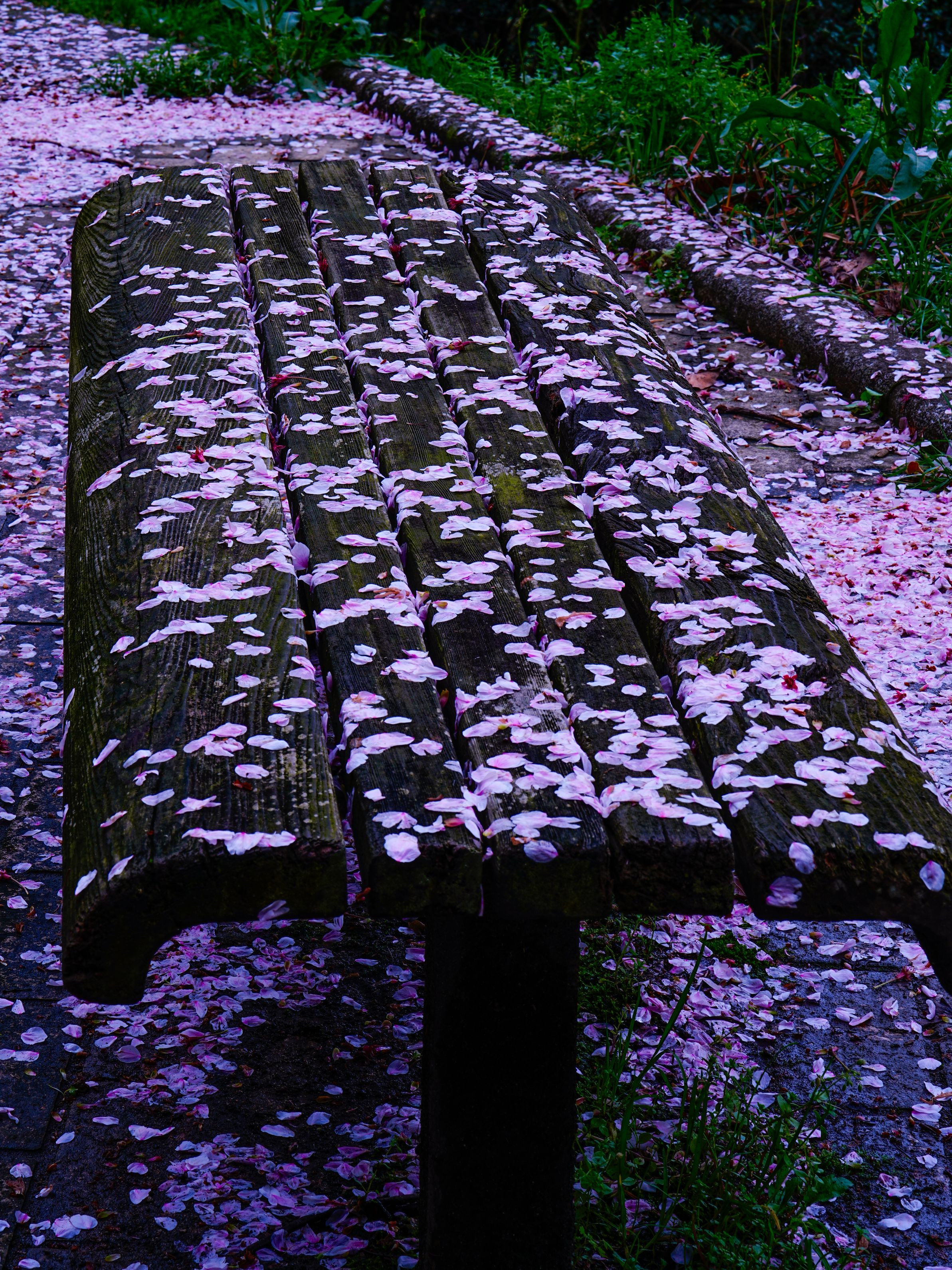 昨日の雨風で桜の花びらは残念ながら落ちて被写体探しに公園を散策していると、朽ち果てそうなベンチに落下した桜の花びらが均等に配置、ベンチが見事にリニューアル!雨風も悪い事ばかりではないなとパチリ!