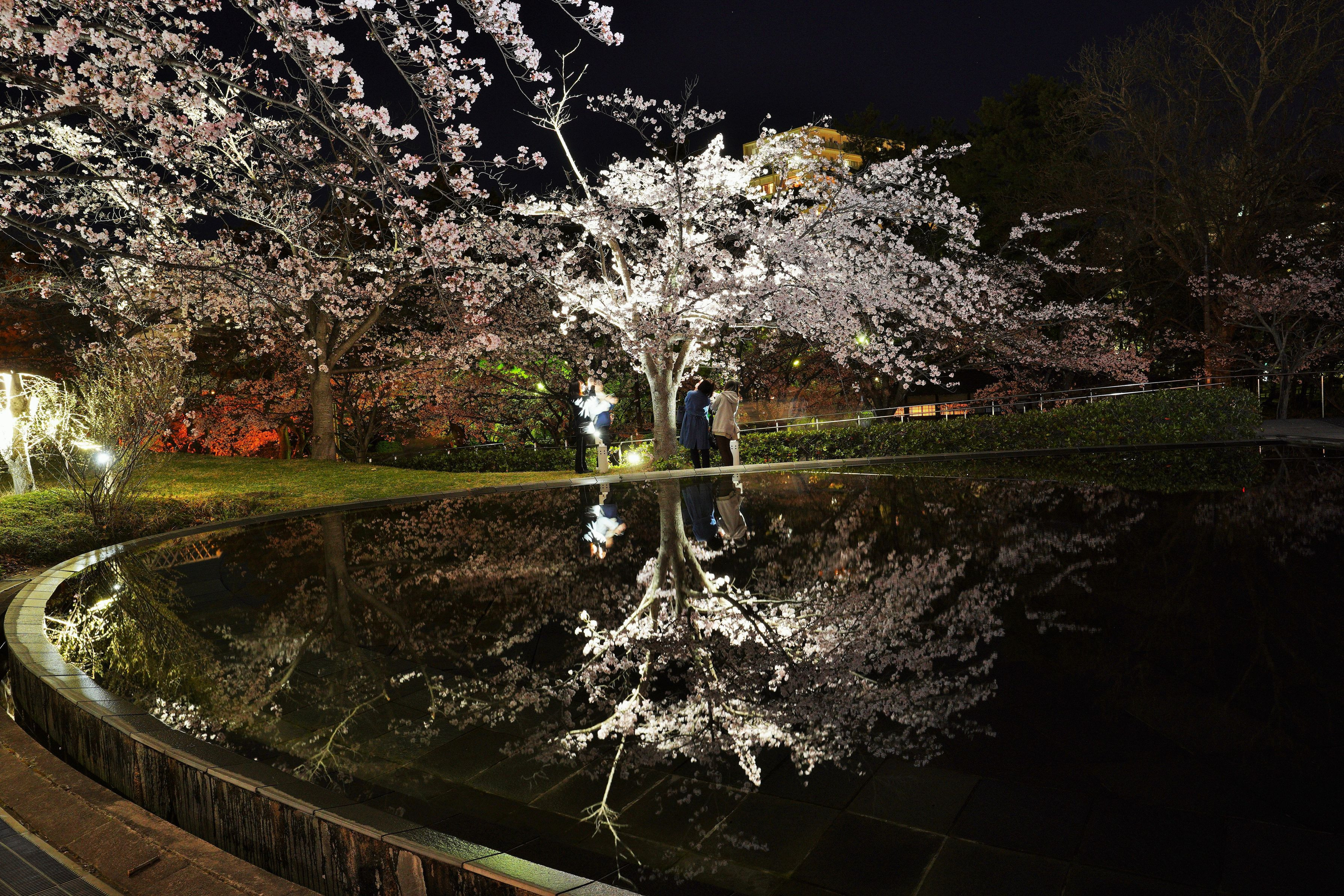 新潟の市民文化会館のりゅーとぴあの、池に映る夜桜です。こちらは建物を入れずに、夜桜を主役にしました。
