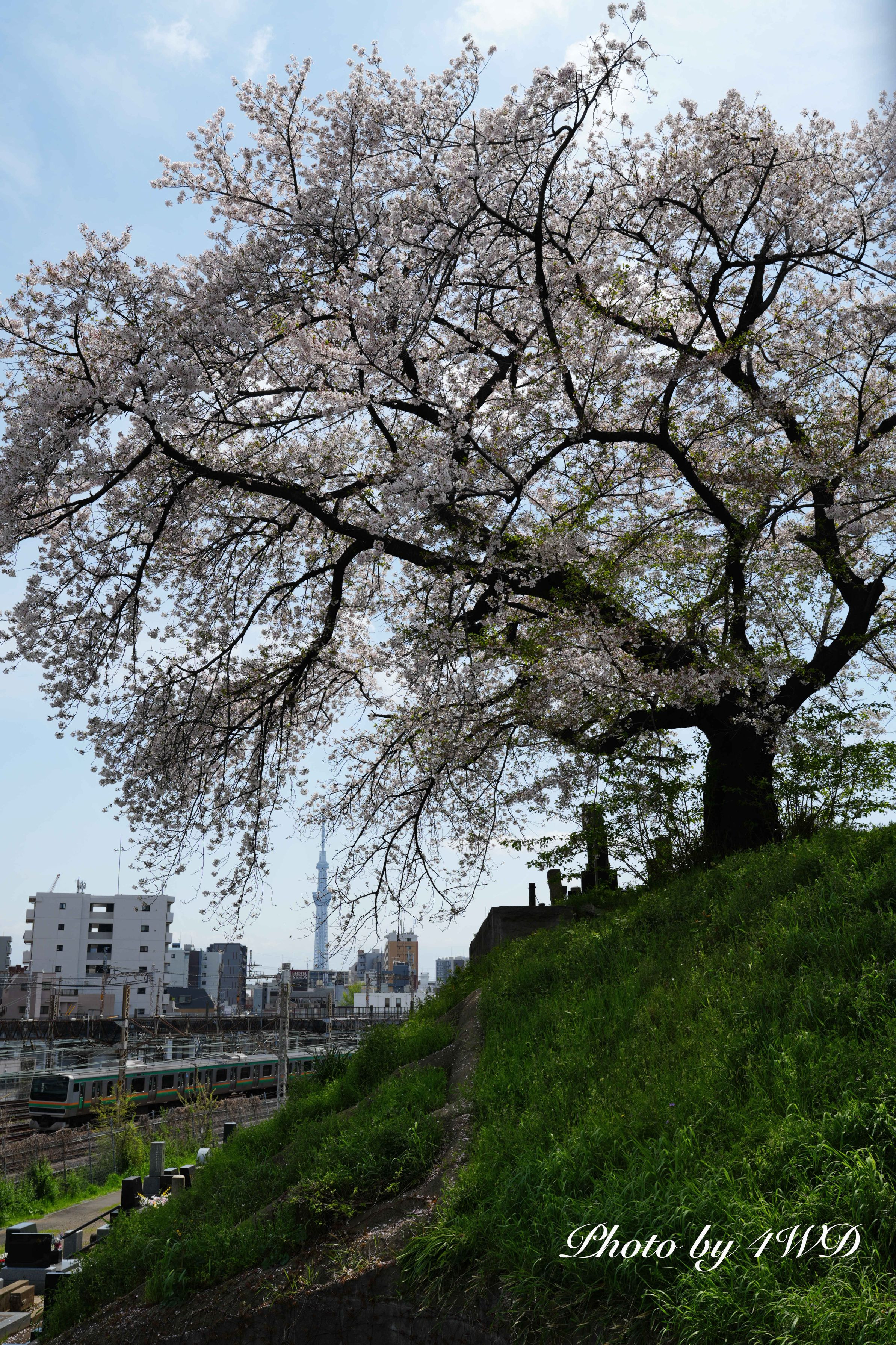 #桜#の古木の多いことで有名な谷中霊園。 まるで田舎の村はずれのような場所の老木を見つけました。 東京スカイツリーや電車を入れて撮りました。