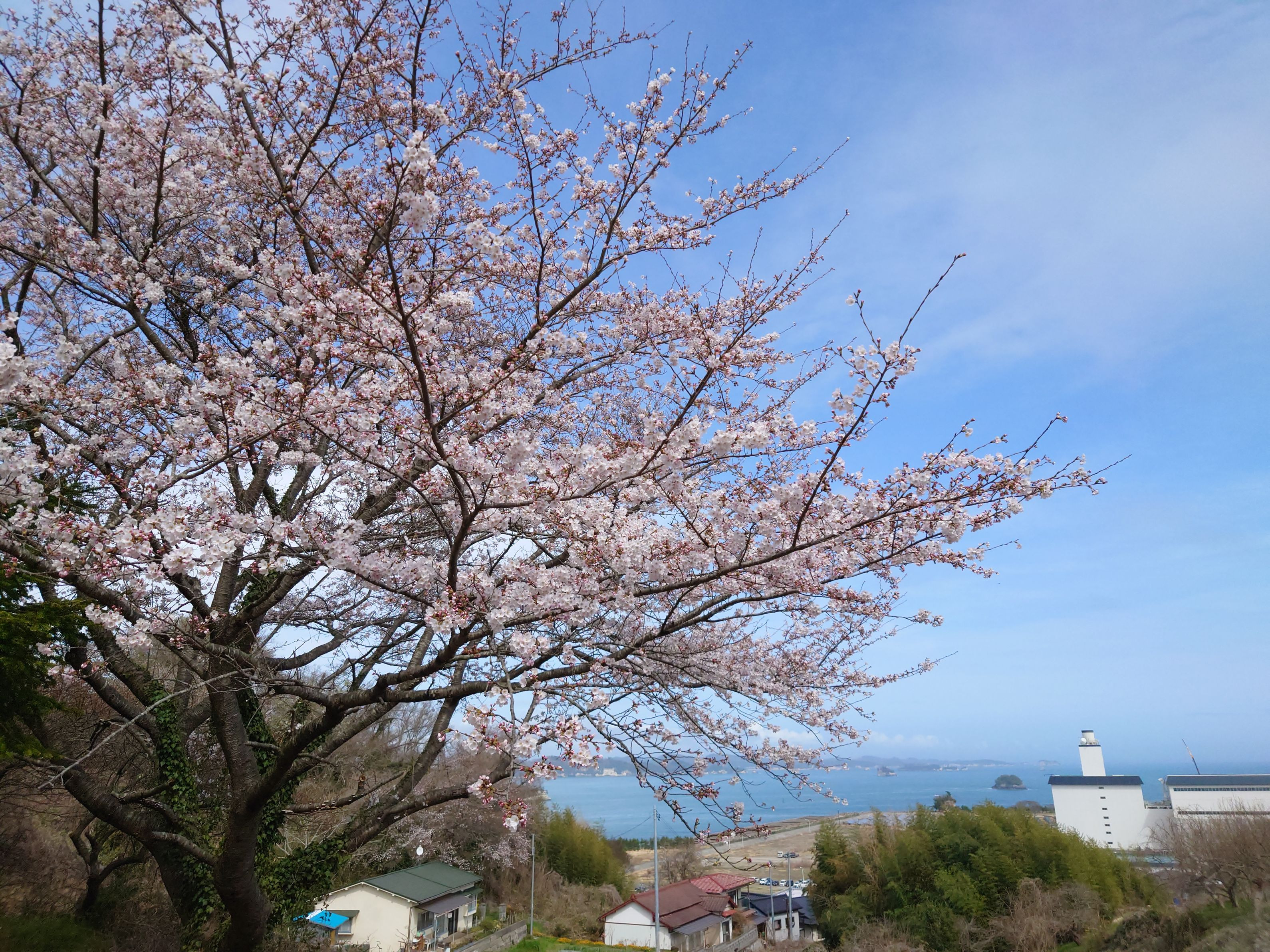 松島四大観多聞山公園で。松島湾の青、火力発電所の白、桜のピンクが綺麗でした。