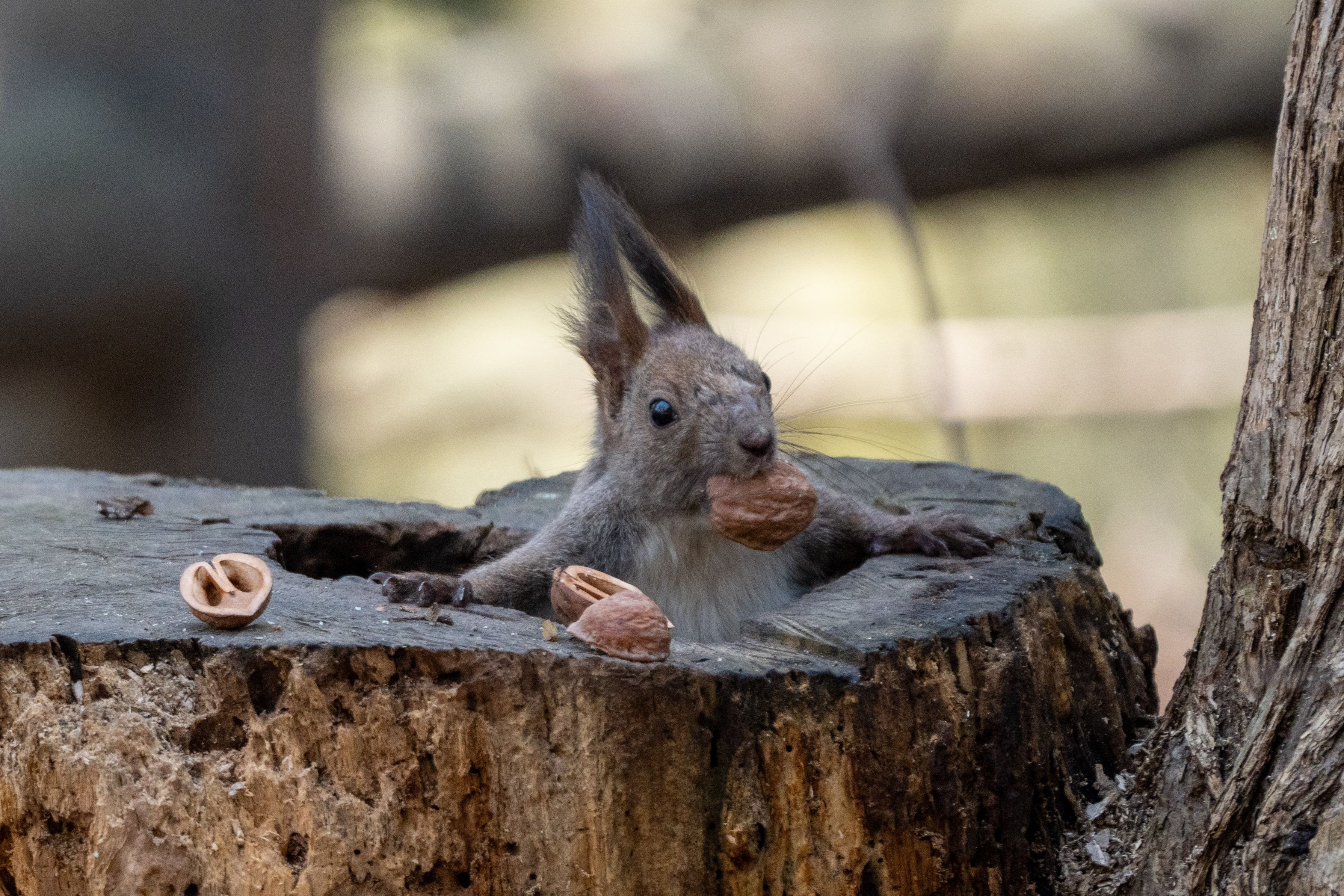 切り株からクルミをくわえて飛び出してきたエゾリス君です。