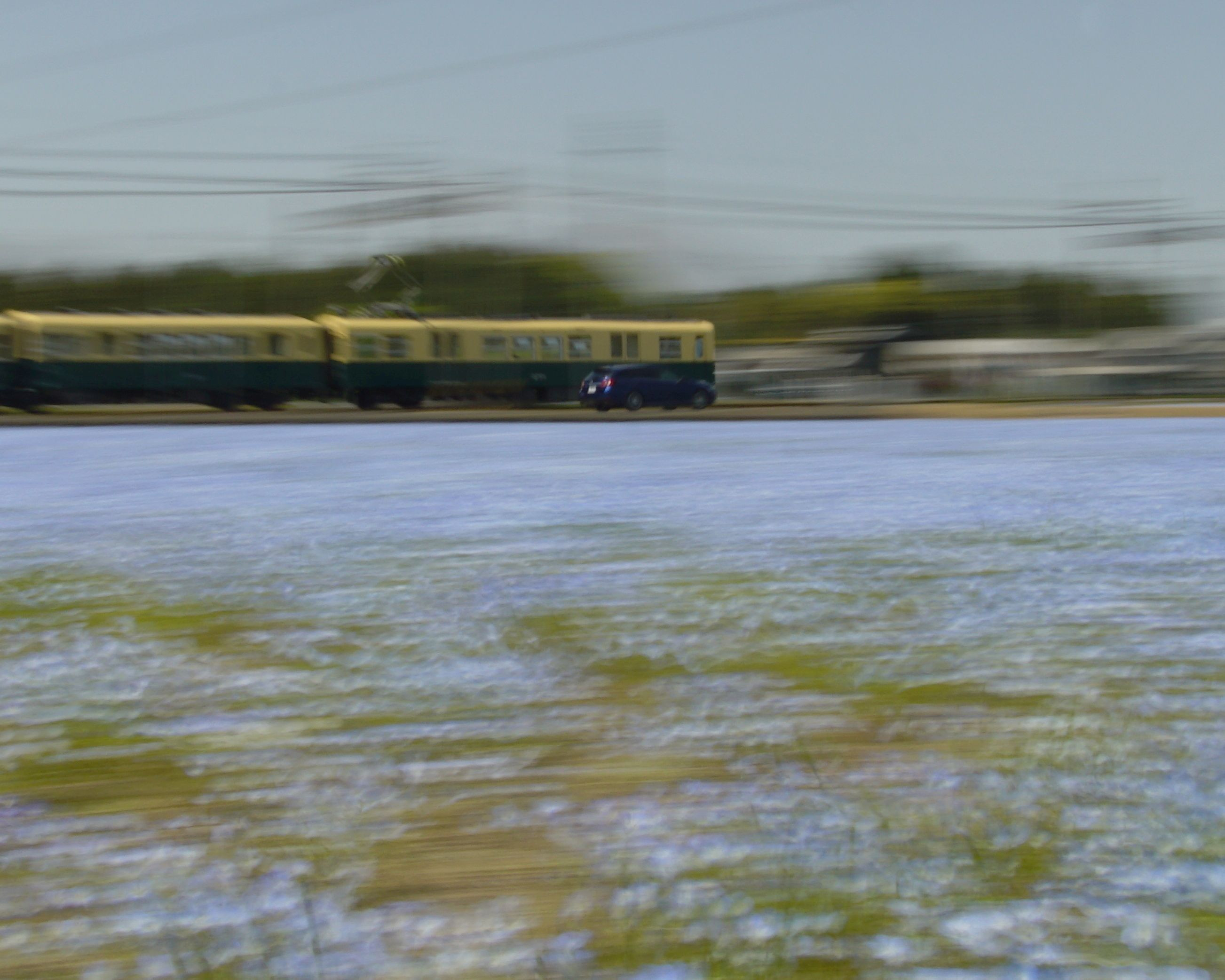 三重県いなべ市大泉駅付近 ネモフィラ 電車と車が並走してカメラマンを困らせていました。