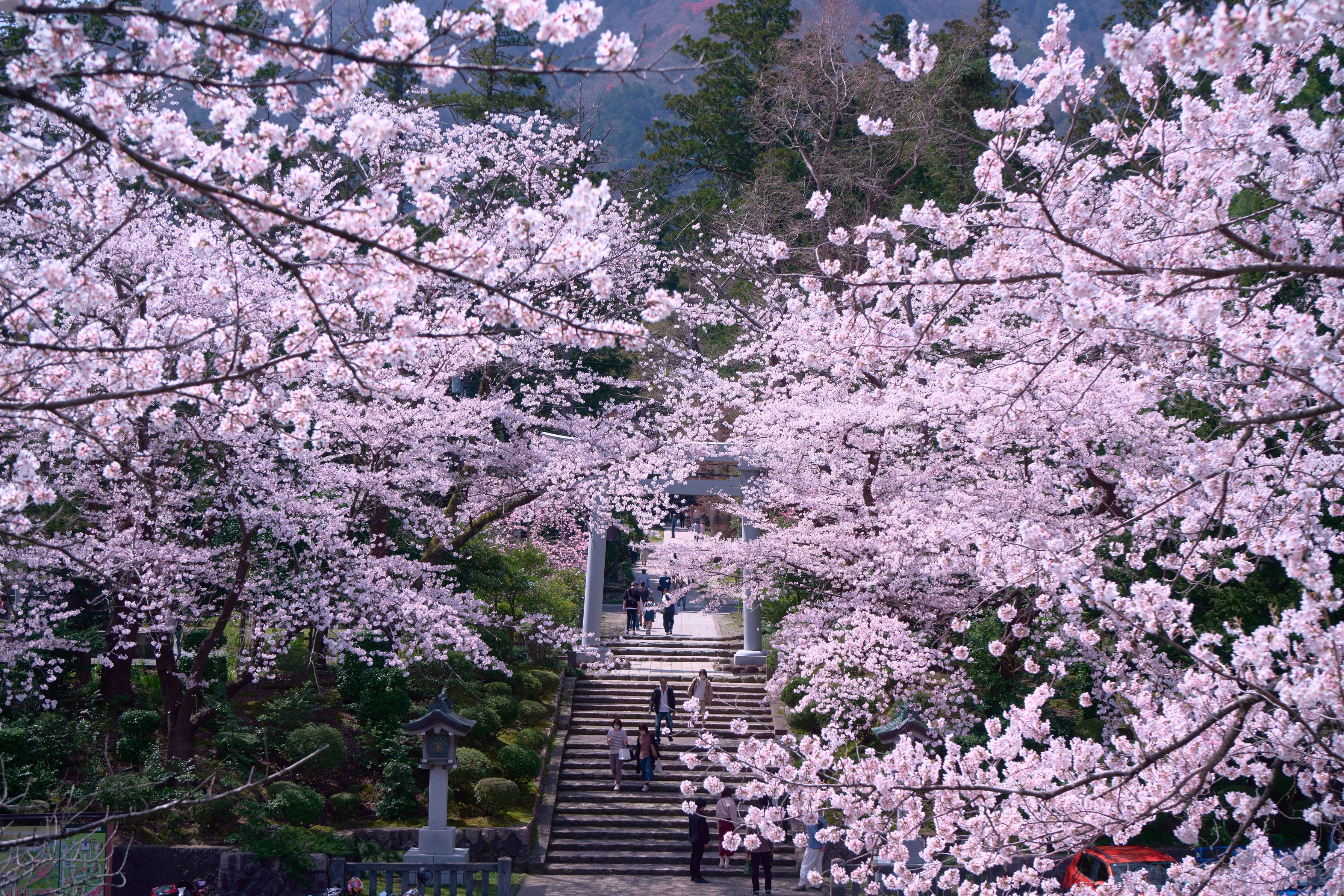 新潟県を代表する神社、「弥彦神社」に咲く桜です🌸