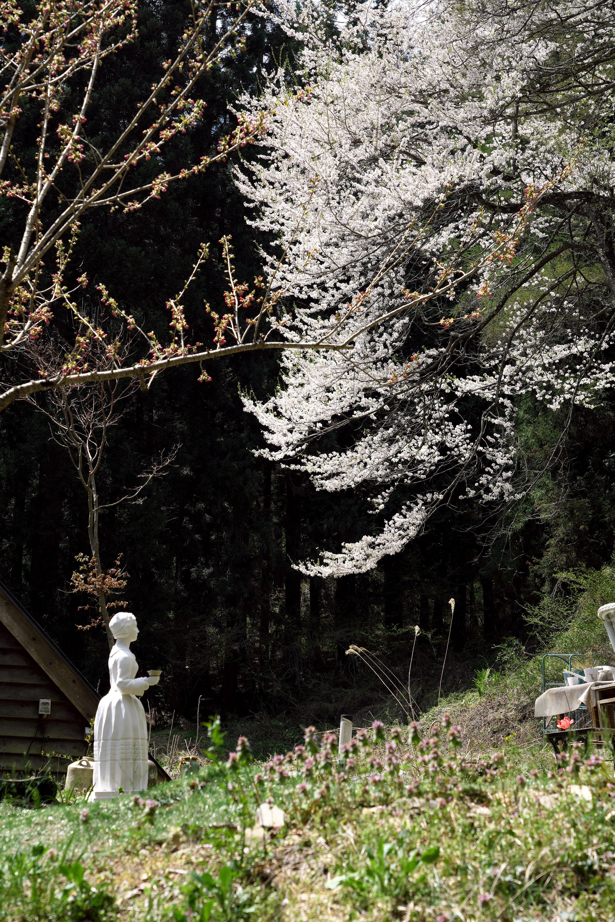 走行中、目に入りました。 乙女の先には桜が咲いています。桜に感謝の気持ちをささげているようでした。