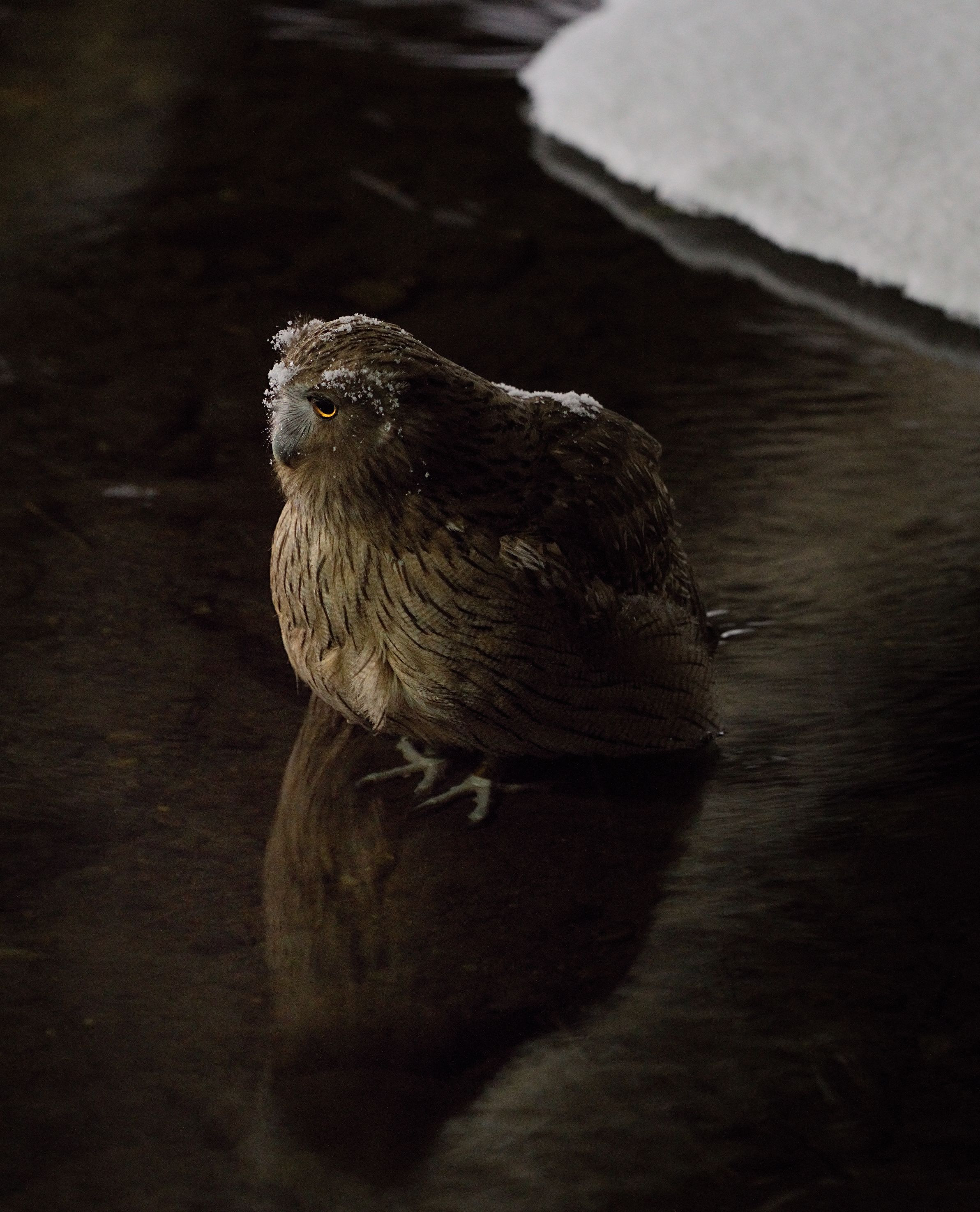 雪がコンコンと降り続き静まり返った深夜。音もなくやってきた。真っ暗な川で一時間の狩りを見届けました。真っ暗で長秒撮影、すぐに動くので何十枚と撮った中の一枚です。