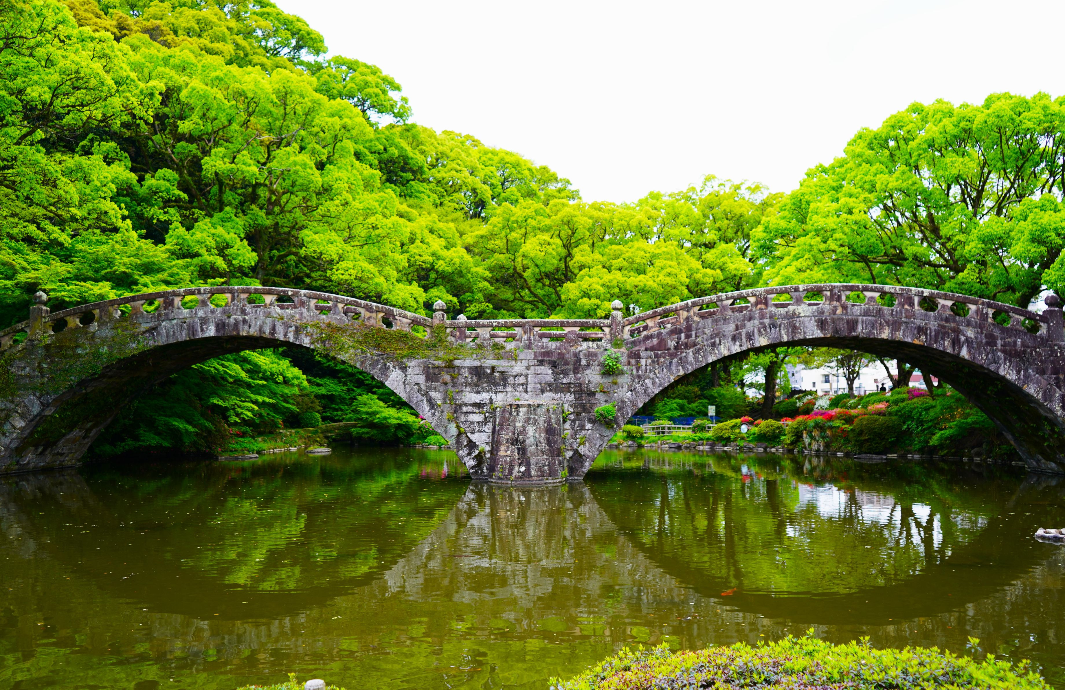 長崎諫早湾の近くの公園に有る階段式の石造り二連アーチ橋で日本一長い橋だそうです。 つつじとコラボで綺麗でした。