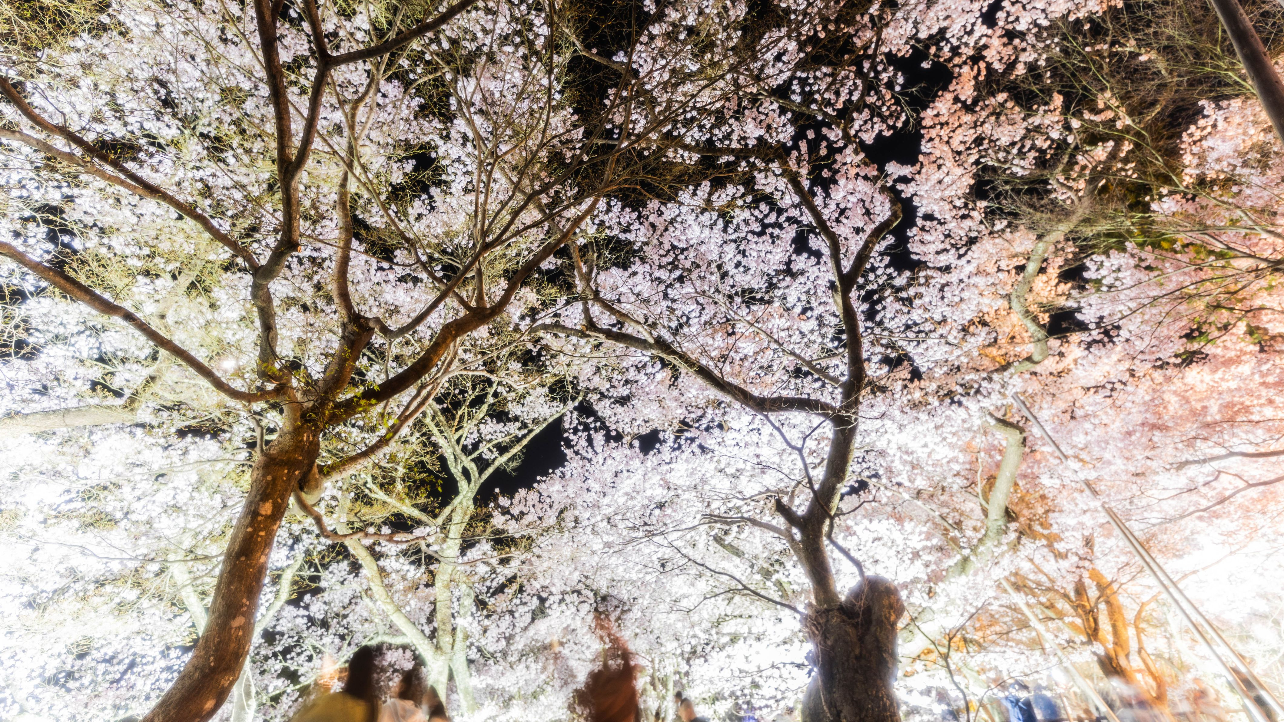 桜満開の高遠城で、広角で上空いっぱいの光輝く桜を撮影しました。