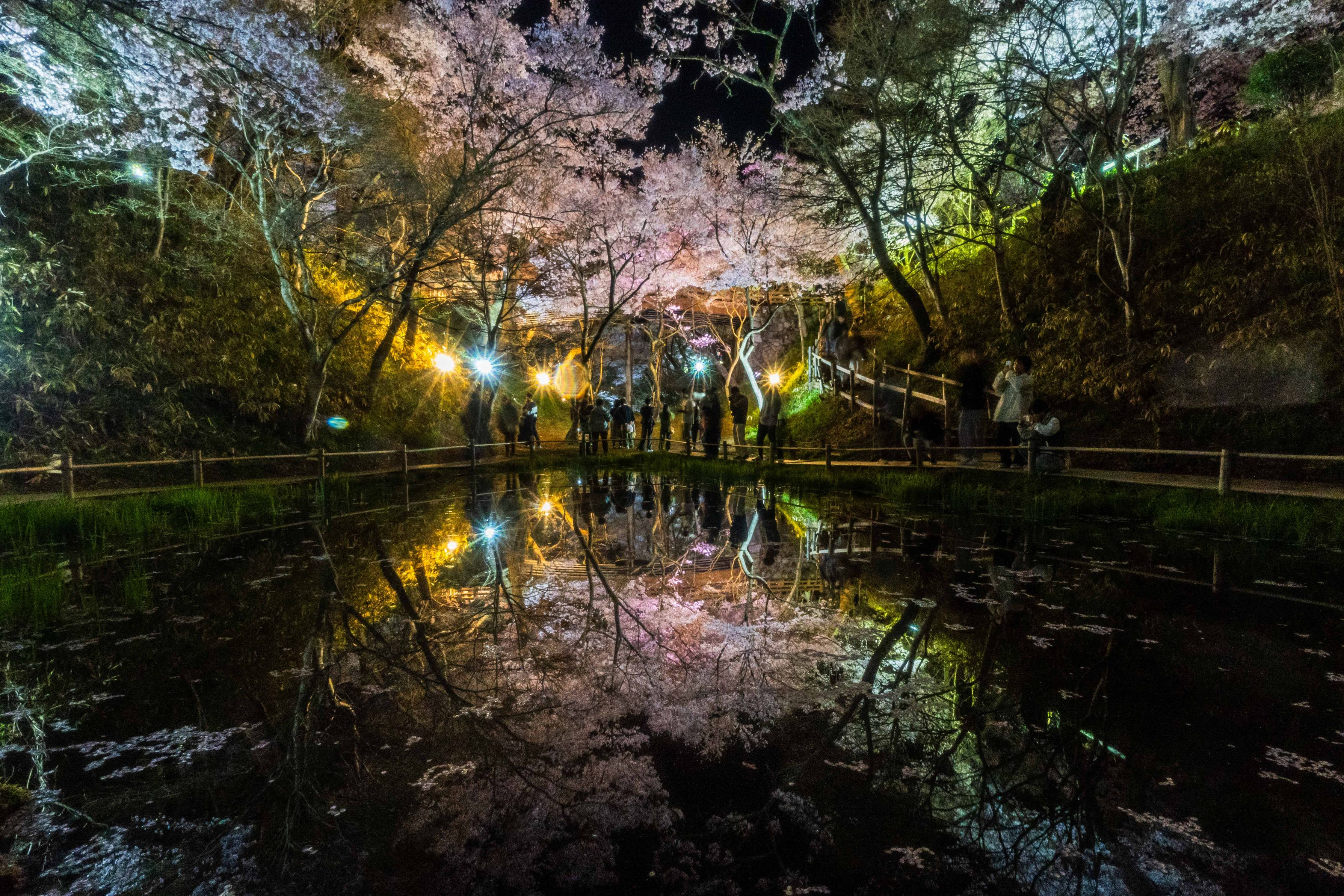 桜が満開の高遠城は人が多く、終了まじかでも写真を撮る人でいっぱいでした。 堀の中に池があり綺麗に桜を映し出していました。