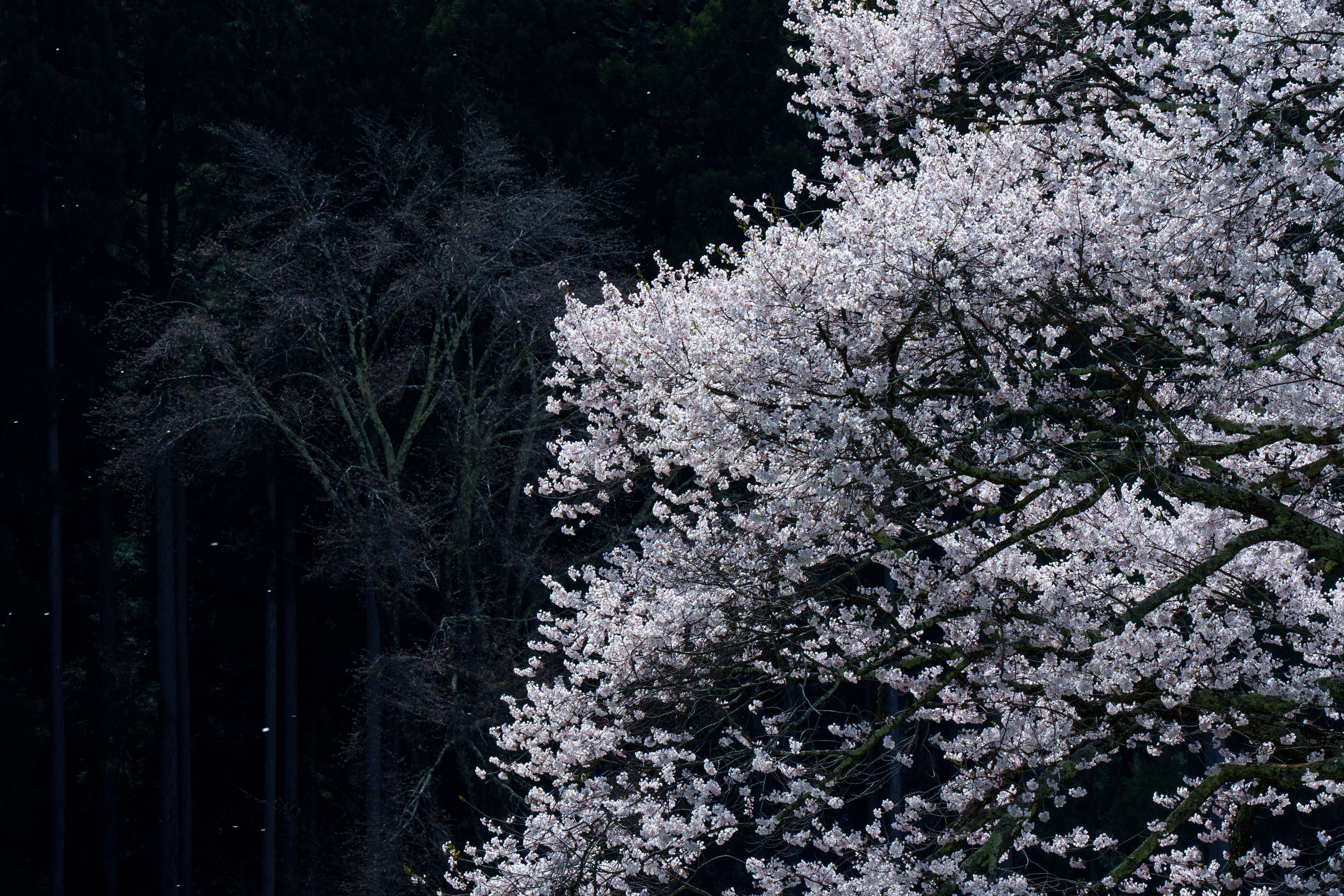 自然の静けさの中で、見事な桜の木が満開になり、暗く神秘的な密林の背景に対して柔らかな輝きを放ちます。青空の下で淡いピンクの花々が光り輝き、春の訪れを待ちわびる周囲の木々が裸で佇む中で、そのコントラストを際立たせます。