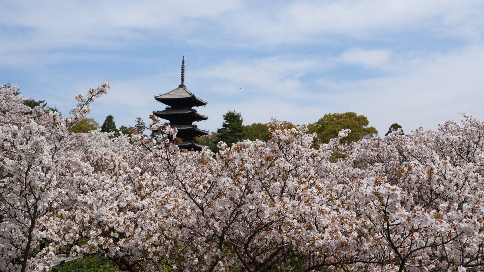 仁和寺の御室桜越しに五重塔を捉えた一枚。五重塔はまるで桜の海に浮かんでいるかのようです。