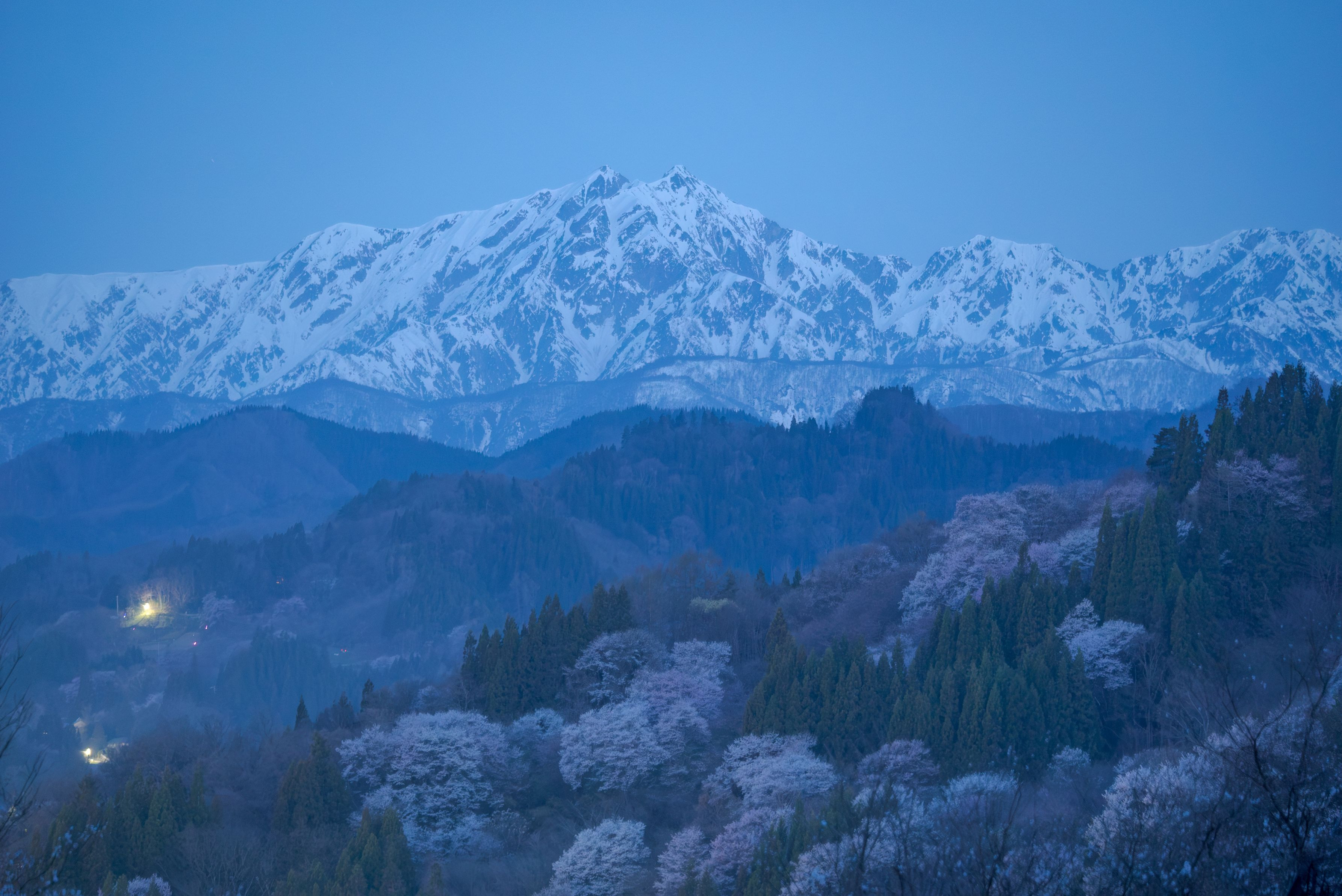 製品情報>My Sony>αcafe>夜明け前の桜と残雪の山(himeさん)