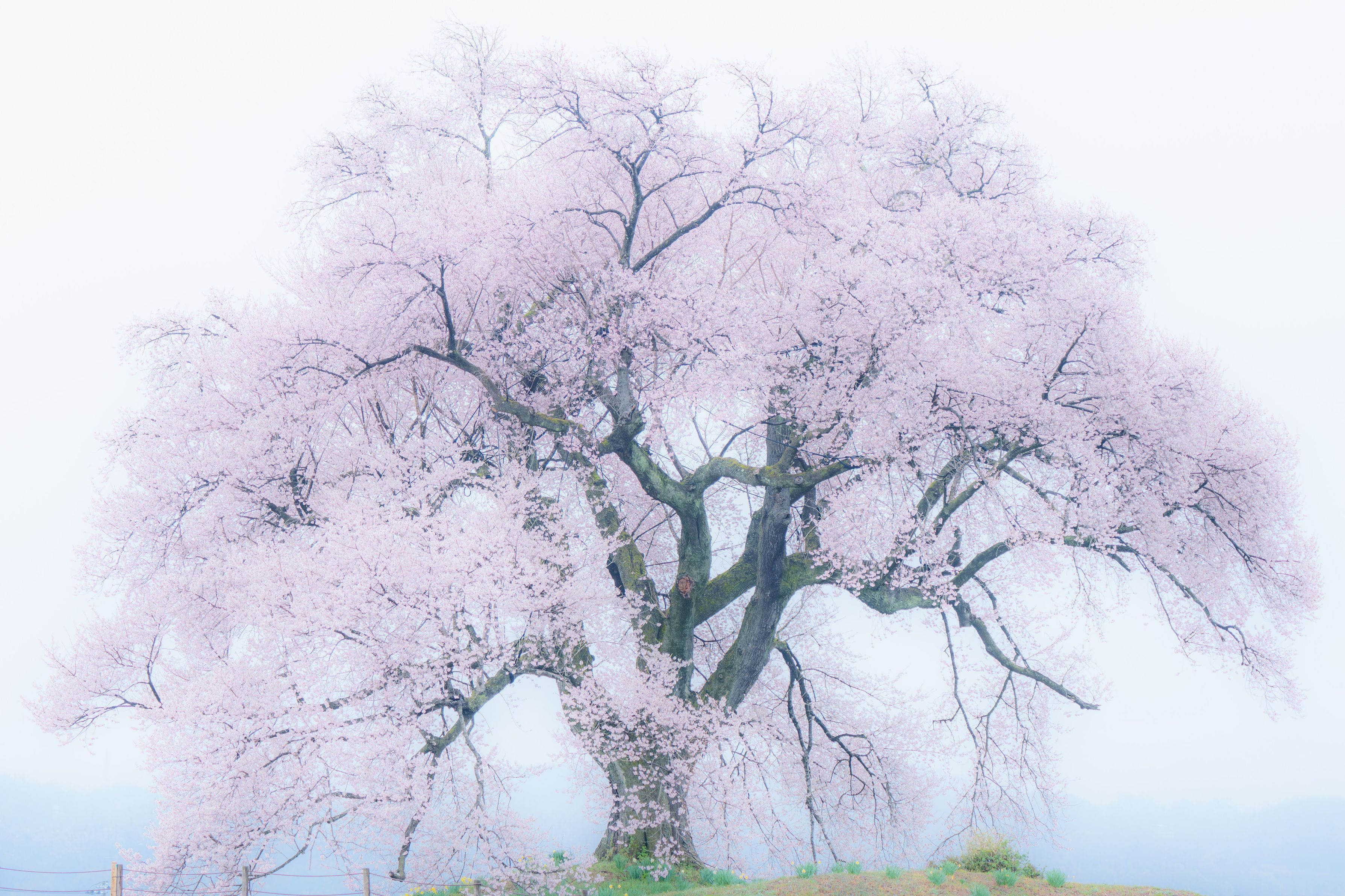 朝霧の中の一本桜。凛とした立ち姿でした。