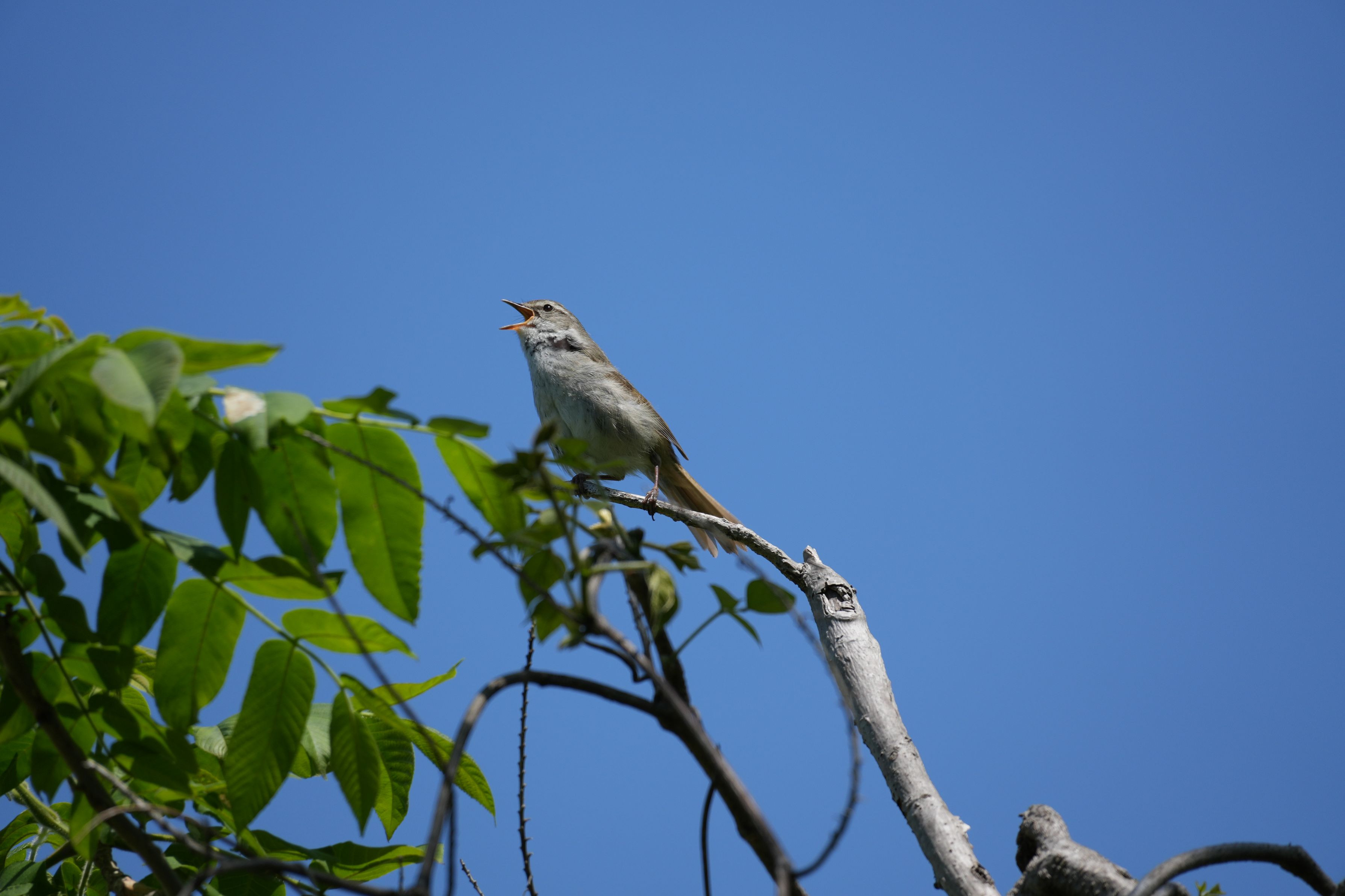 河川敷の小枝にとまって元気に鳴いていました。 10m程に近づいても大丈夫でした。