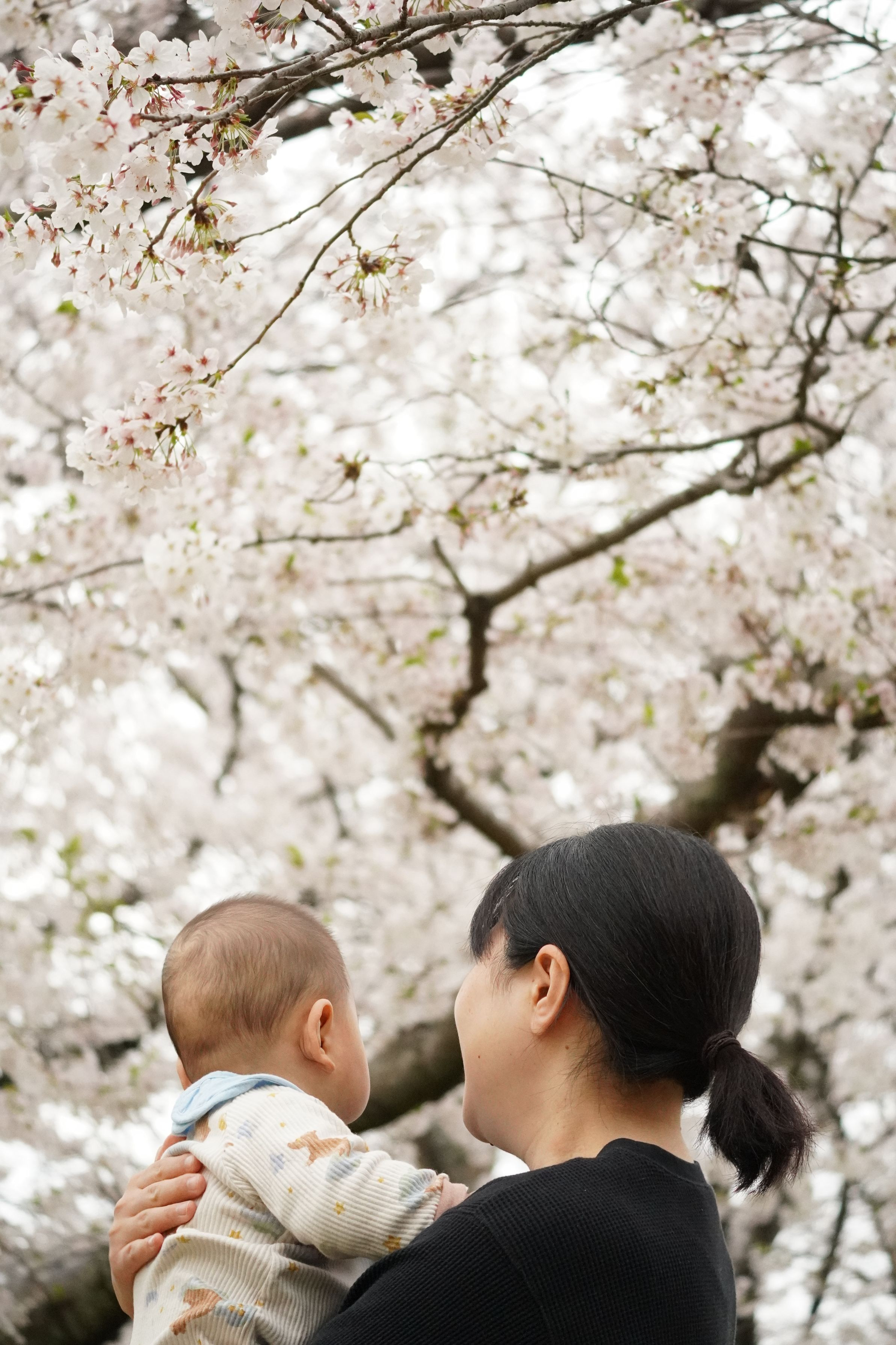 妻と生後7ヶ月の息子と満開の桜を観に行った時の1枚です。 息子は人生初の桜を不思議そうに見つめていました。