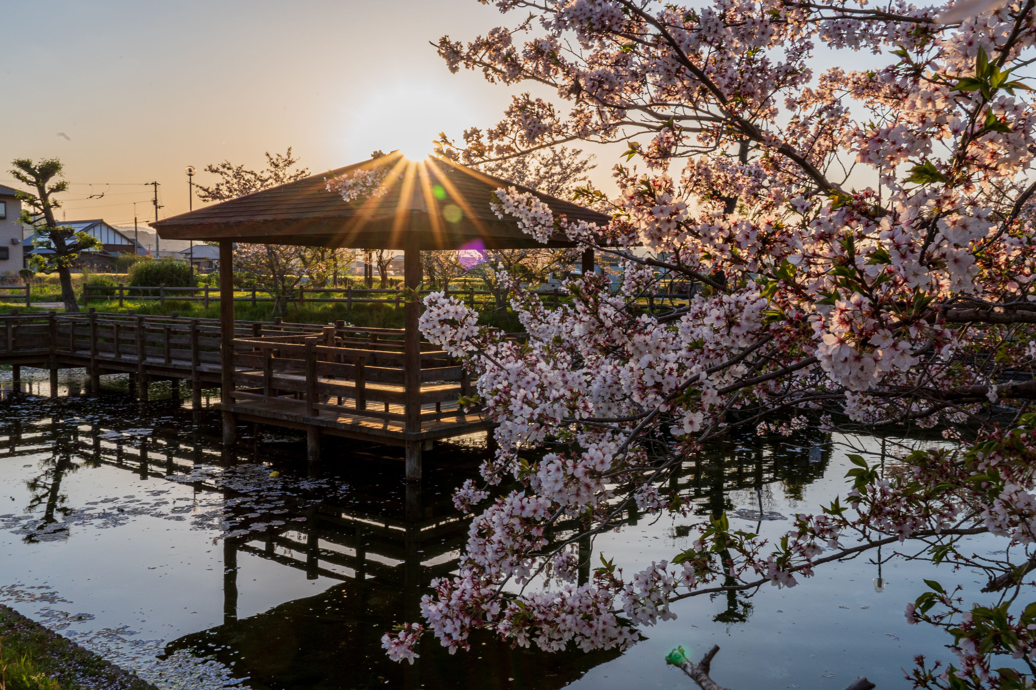 弁天泉に咲く桜が夕陽に照らされて綺麗でした。