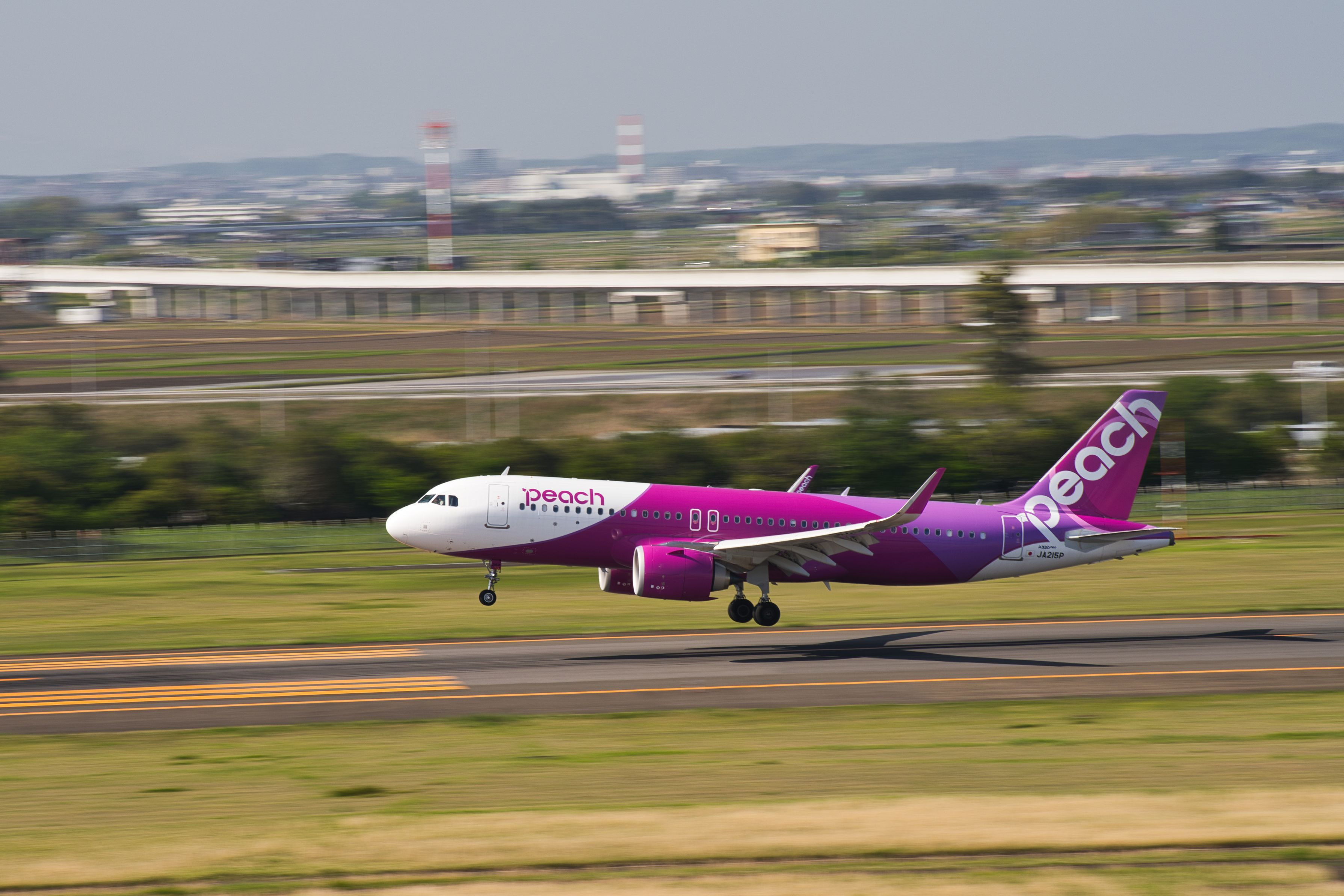 仙台空港へ到着するピーチエアラインを流し撮りで! 新緑に映えますねーー