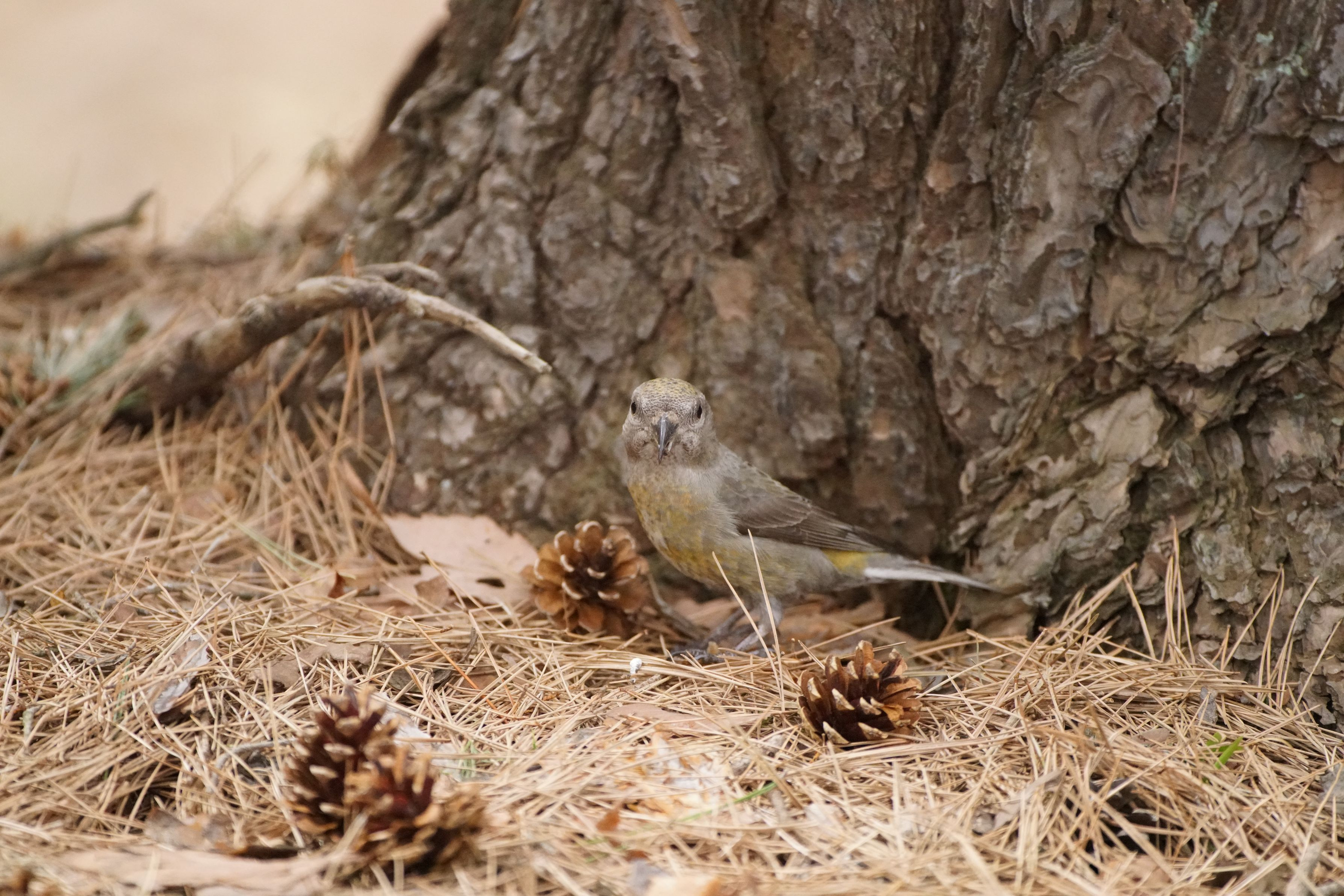イスカの雌です。群れで地面にたくさんイスカがいました。近くに来てくれたので、シグマの500/4.5を手持ちして撮影。画像を確認してみたらカメラ目線で「私、これからお昼ご飯だけど邪魔しないでね」とでも言いたげな感じでした。