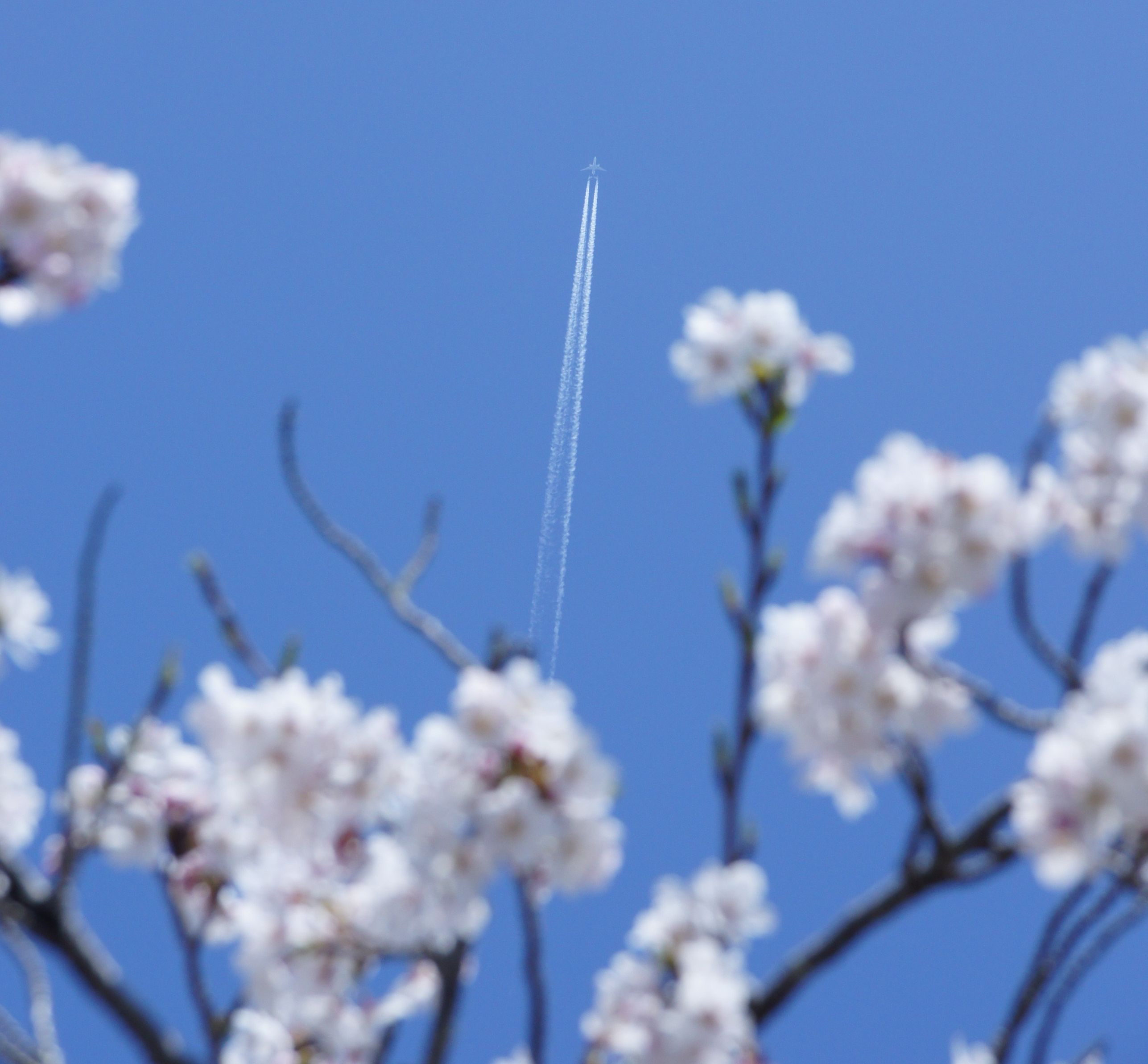 さくらの時期の写真。たまたま飛行機が抜けて行きました。