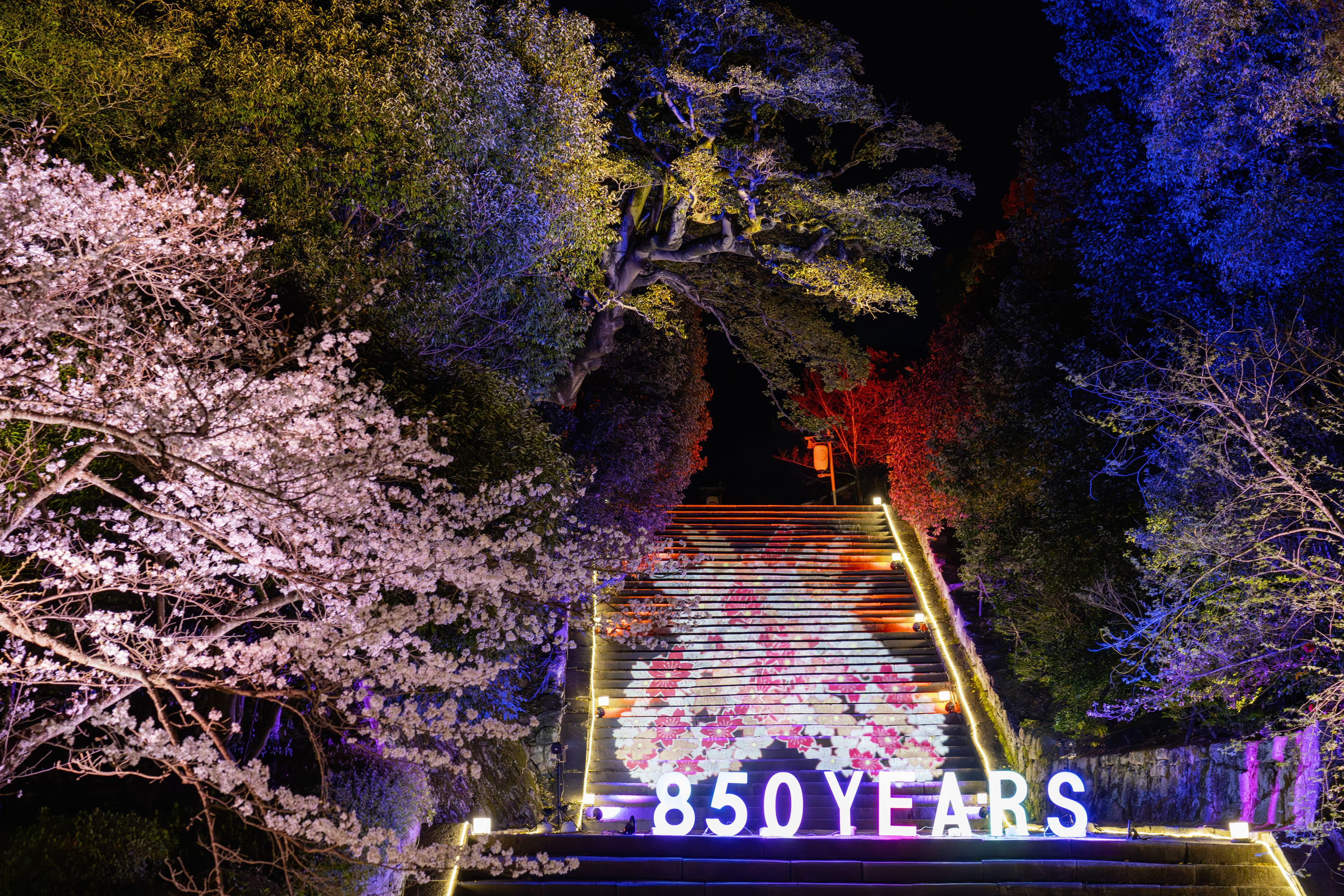 知恩院の男坂の プロジェクションマッピング 坂の桜が色が色々変わり 桜がクルクル動き 850YEARSの文字も 後ろの木々も色が変わり 心が落ち着く 静かな音楽が流れていて 見惚れてしまいました。