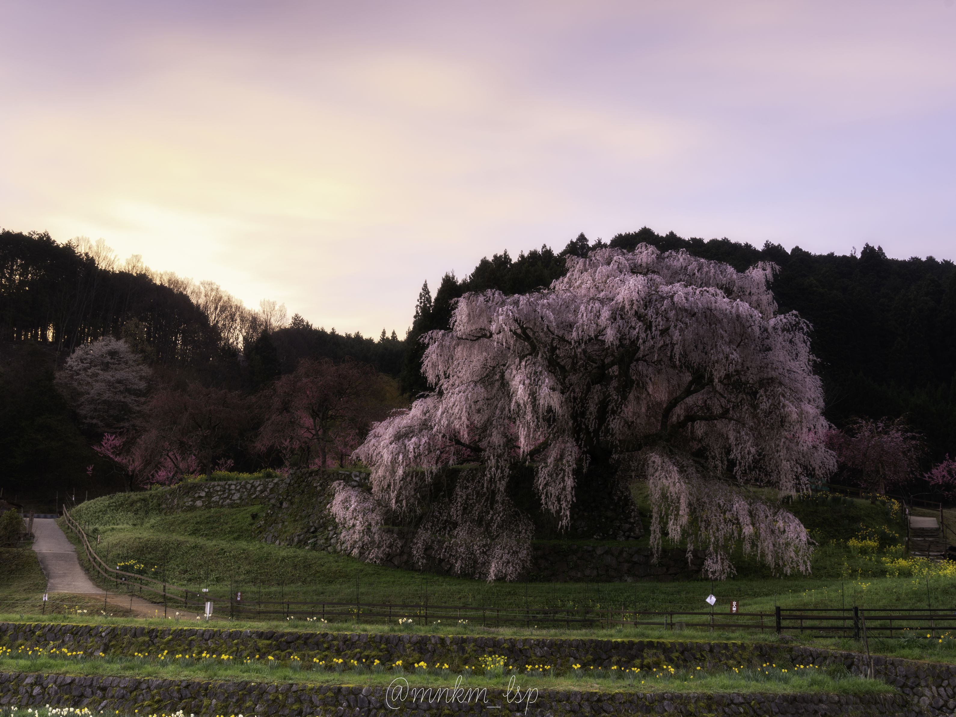 天の川撮影後、朝日に照らされる又兵衛桜を 待っていましたが雲が多くてなかなか太陽は出てこず。 けれど暫く待つと雲の間から太陽が現れて 又兵衛桜を優しく照らしはじめました。 その時にほんの数分だけ空が焼けた瞬間の一枚。 今年も又兵衛桜を見に来れてよかった。