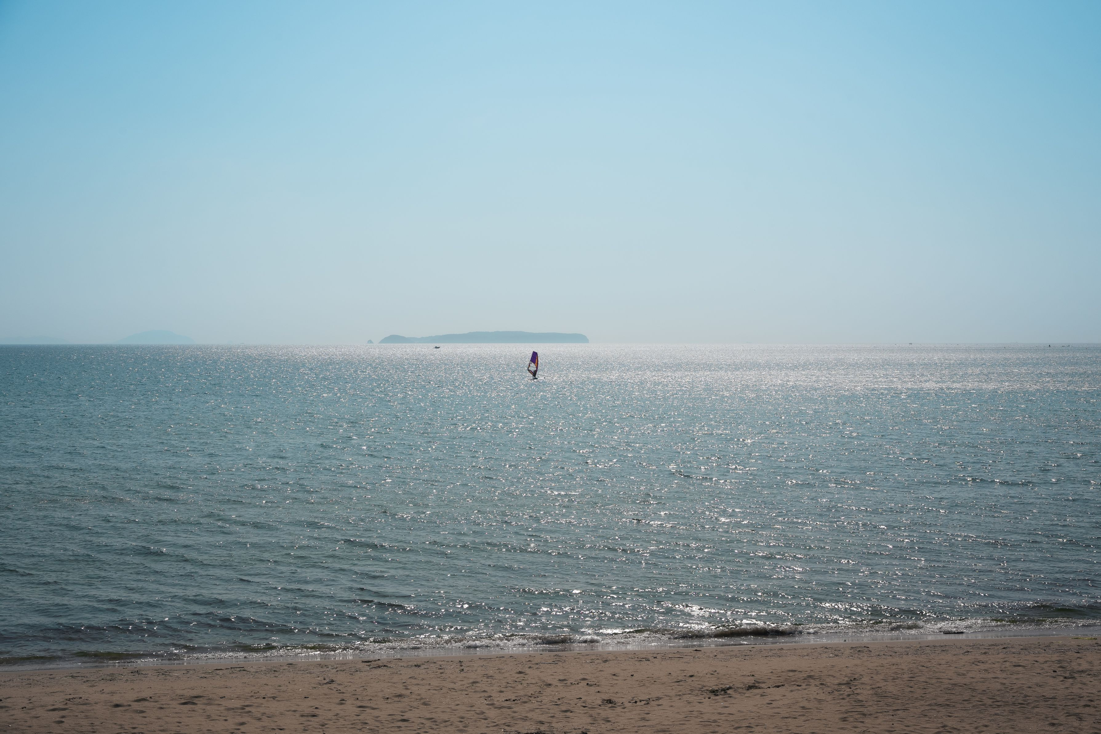 雲一つない快晴の福津海岸。 ぽつんと浮かぶウインドサーフィンのセールが印象的でした。