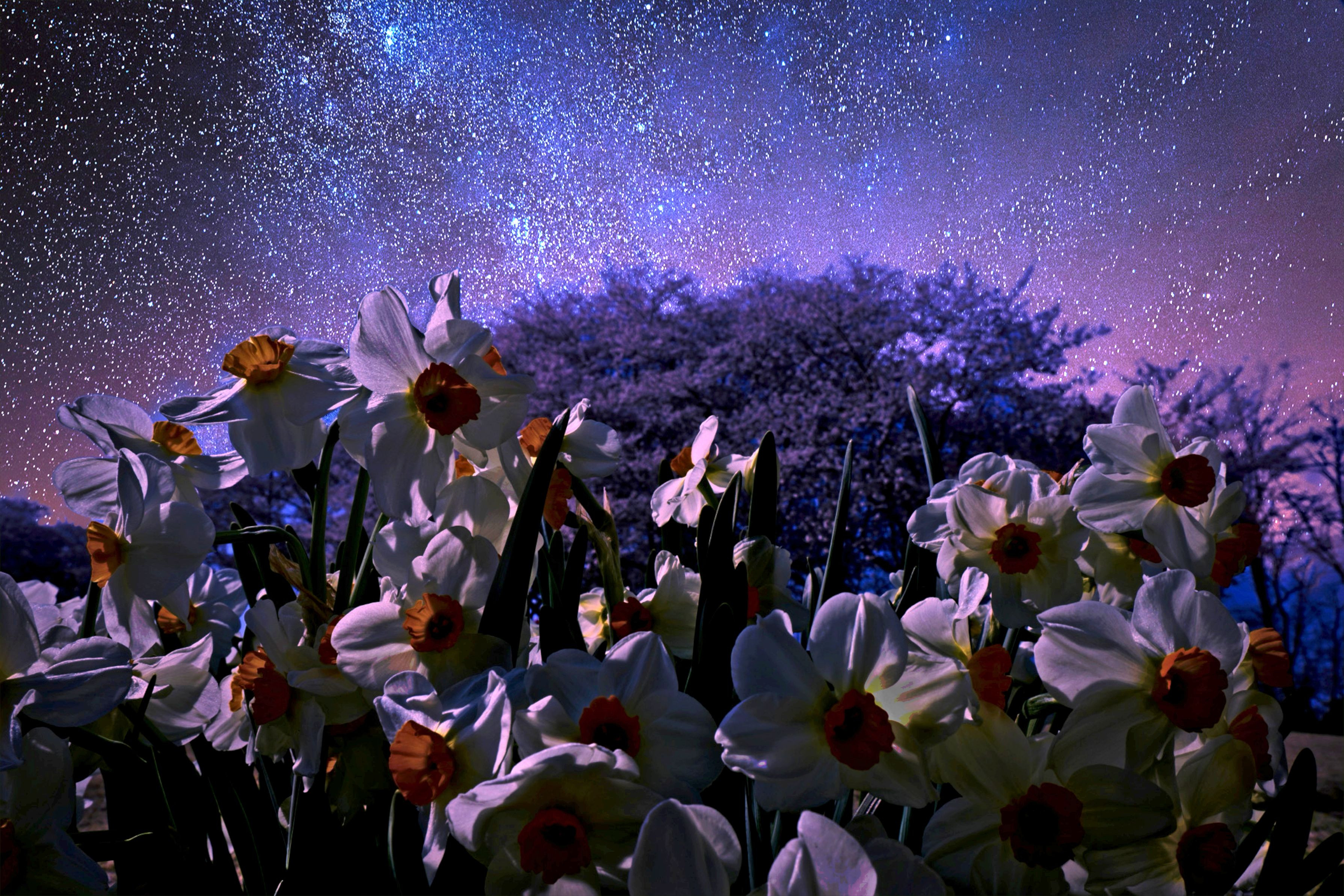夜桜を目当てに桜山へ 奥へ行くほど水仙が多く自生 桜と水仙花の両方撮り