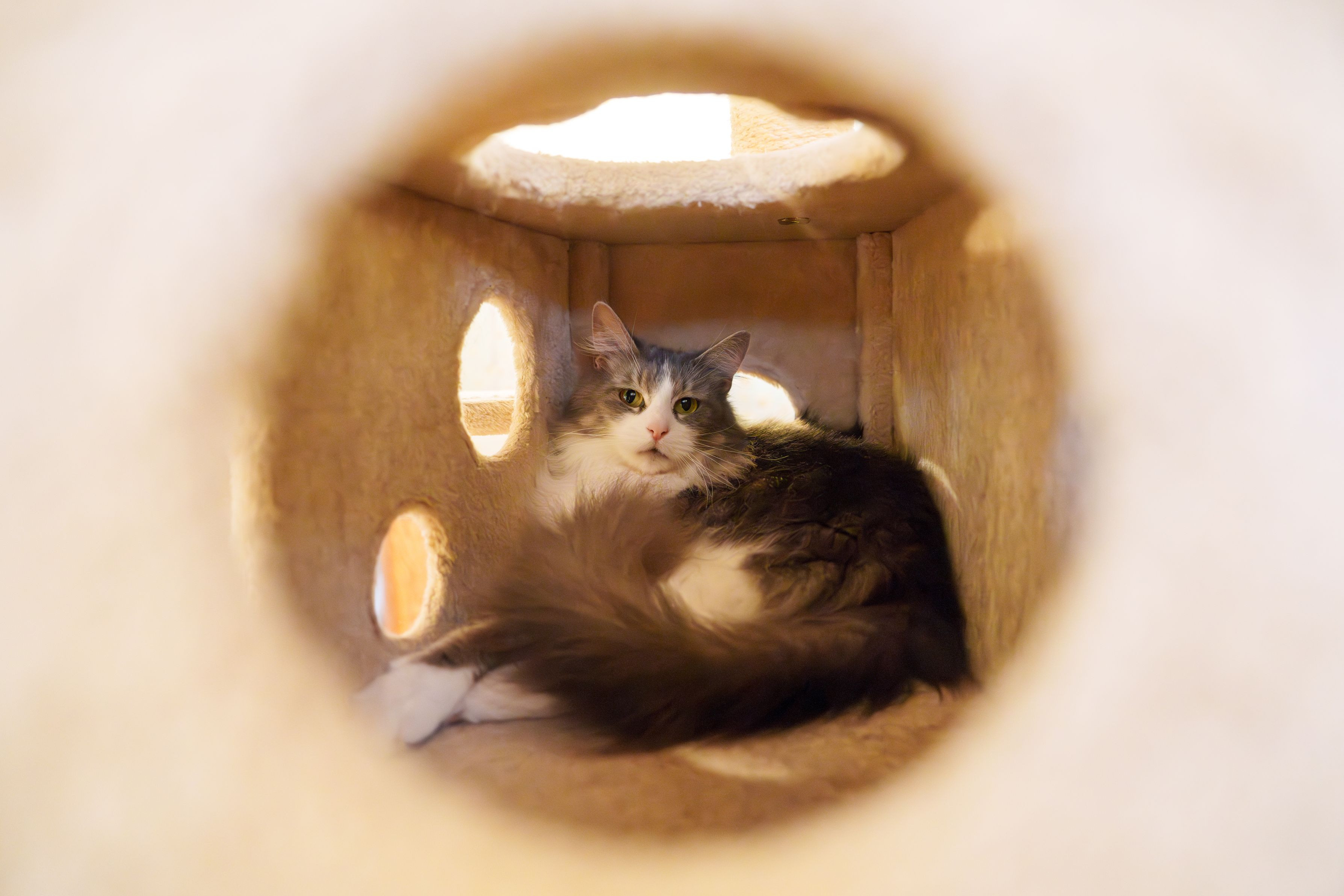 富士サファリパーク ネコの館のネコちゃんです。 箱にこもって眠そうにしていました。 公式サイトではメインクーンとありました。