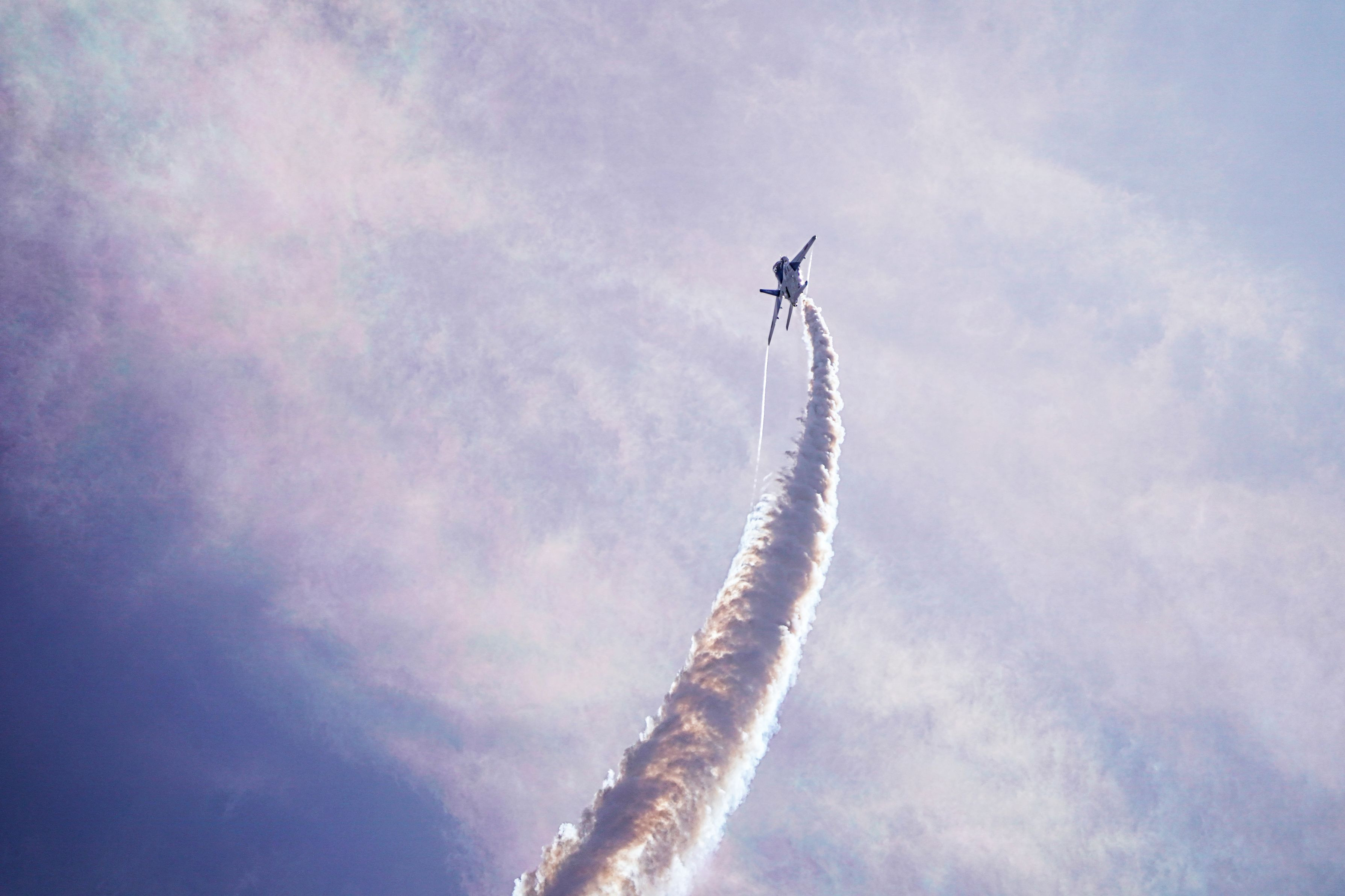 海上自衛隊/米海兵隊岩国航空基地フレンドシップデー2024年。 空が虹色に染まっていました。 上昇するブルーインパルス。