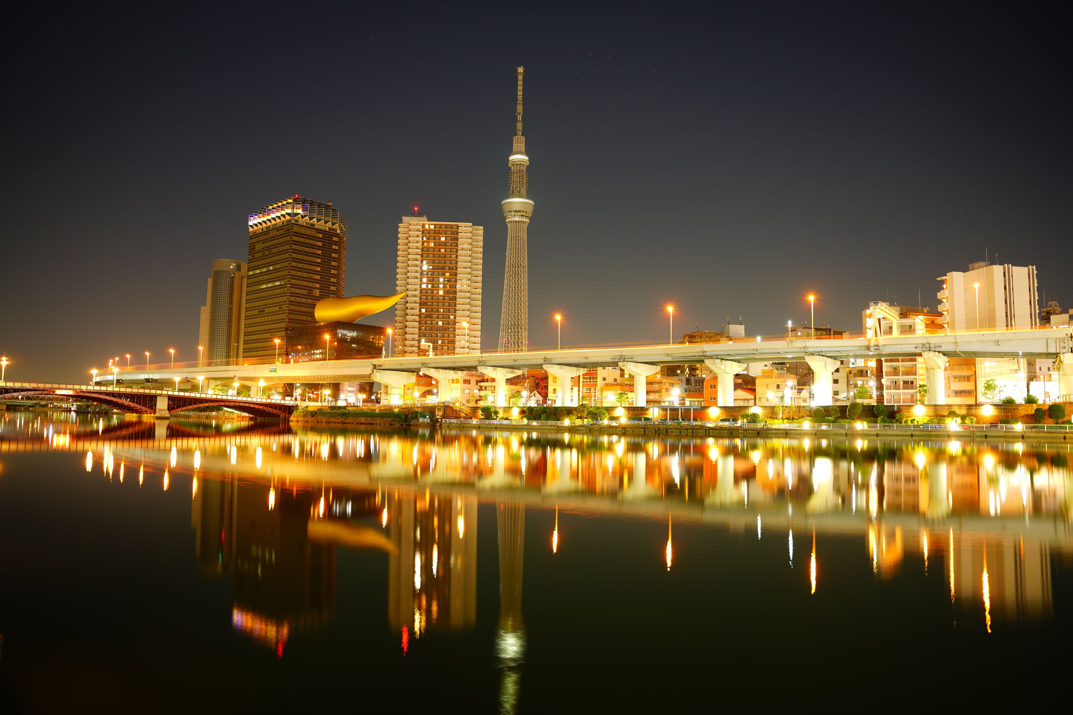 5月3日 浅草寺をでて隅田川にやってきました。 日中とかスカイツリーがライトアップ時によく見る フレーミング・構図でしょうけれど遅い時間なので このような一枚となりました。 スカイツリーがライトアップされていませんが煌めきが 美しかった。。(*^^*)ウヒョウ~