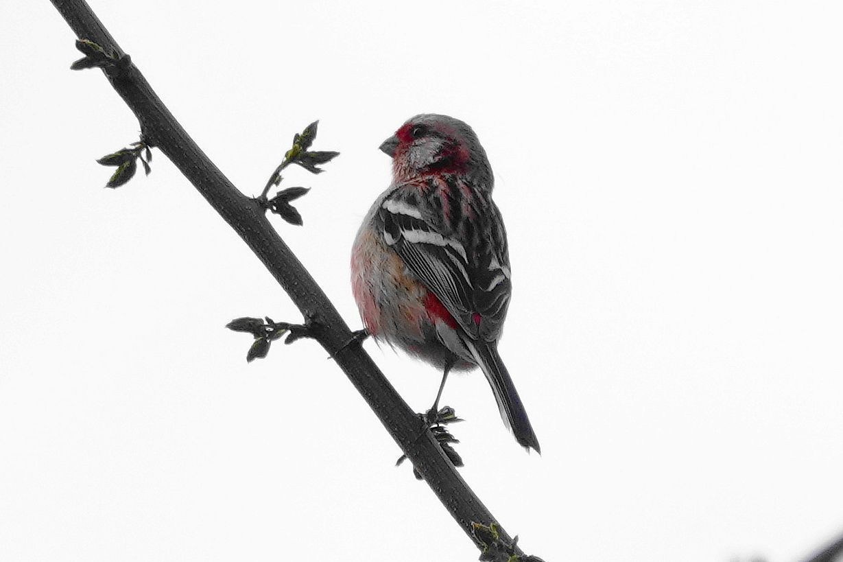 ベニマシコ♂が1羽だけカワラヒワに混じっていました