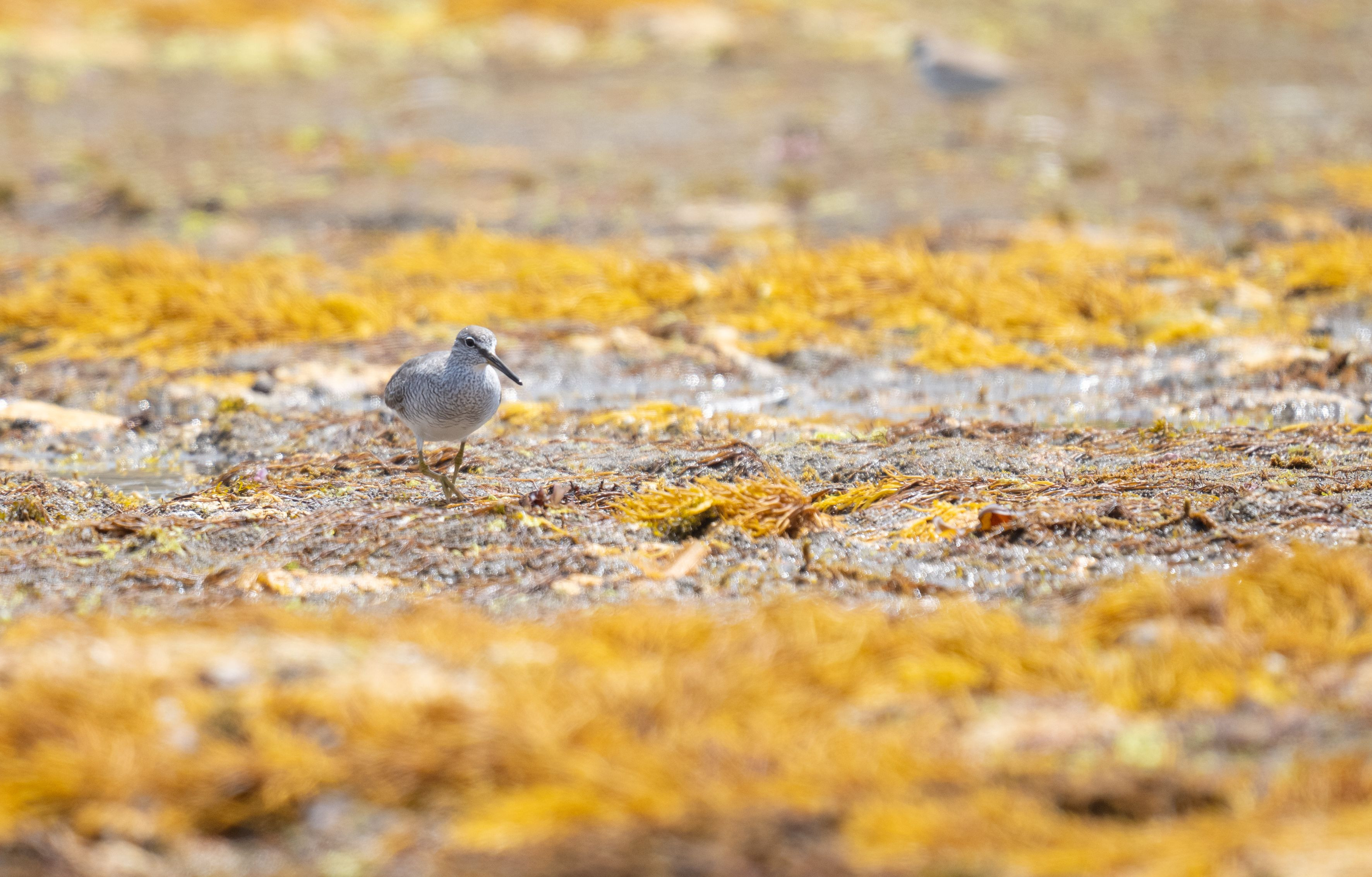 岸辺の海藻とキアシシギのコラボです。 ツンドラまでの旅路途中の一休み中でした。