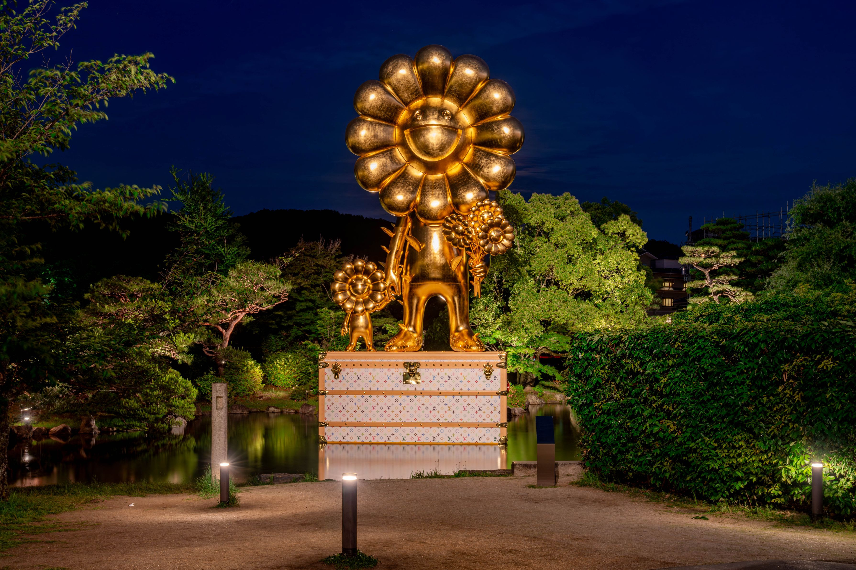 京セラ美術館で開催中の『村上隆 もののけ 京都』。 東エントランス前の日本庭園に巨大な彫刻が。 ルイ・ヴィトンのトランクに乗った可愛い親子です。