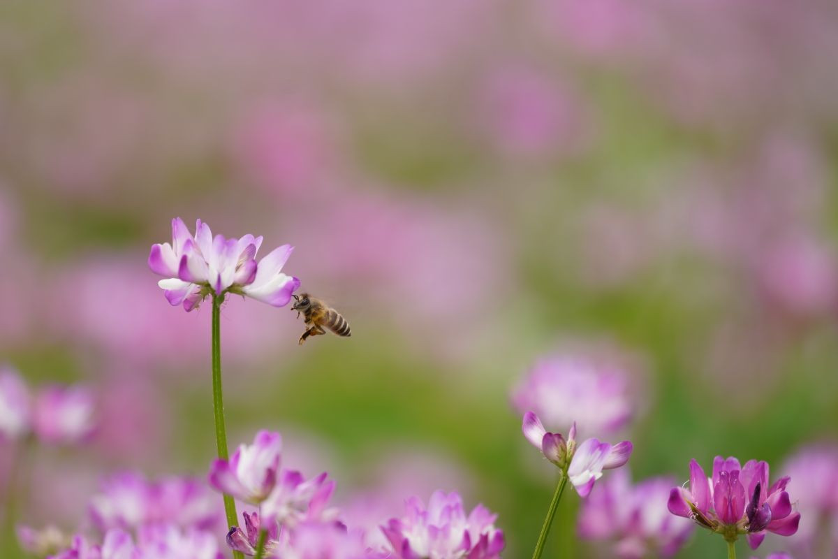 花にピントを合せたまま、色々姿勢を変えている途中に飛んできた蜂とともに