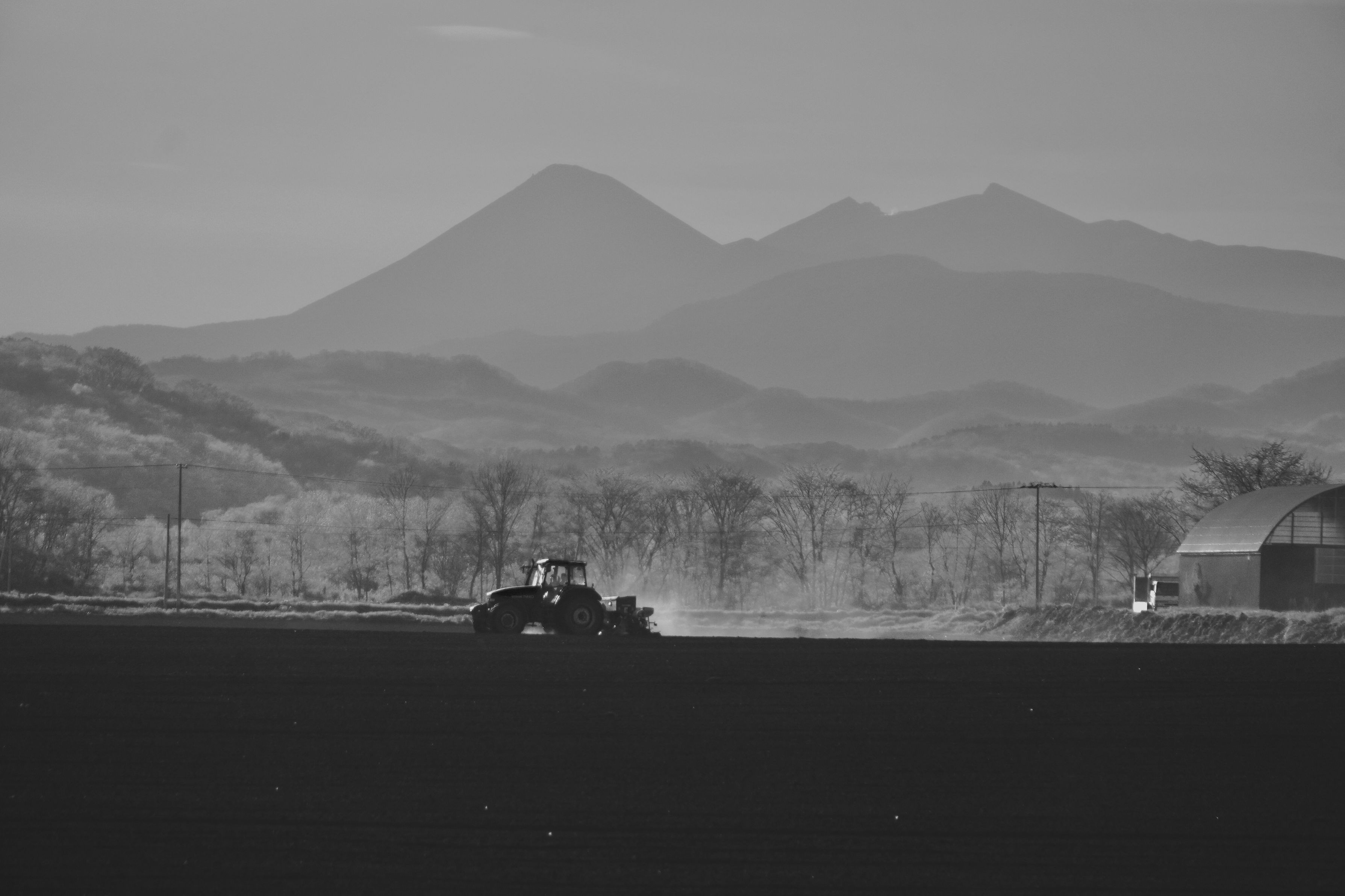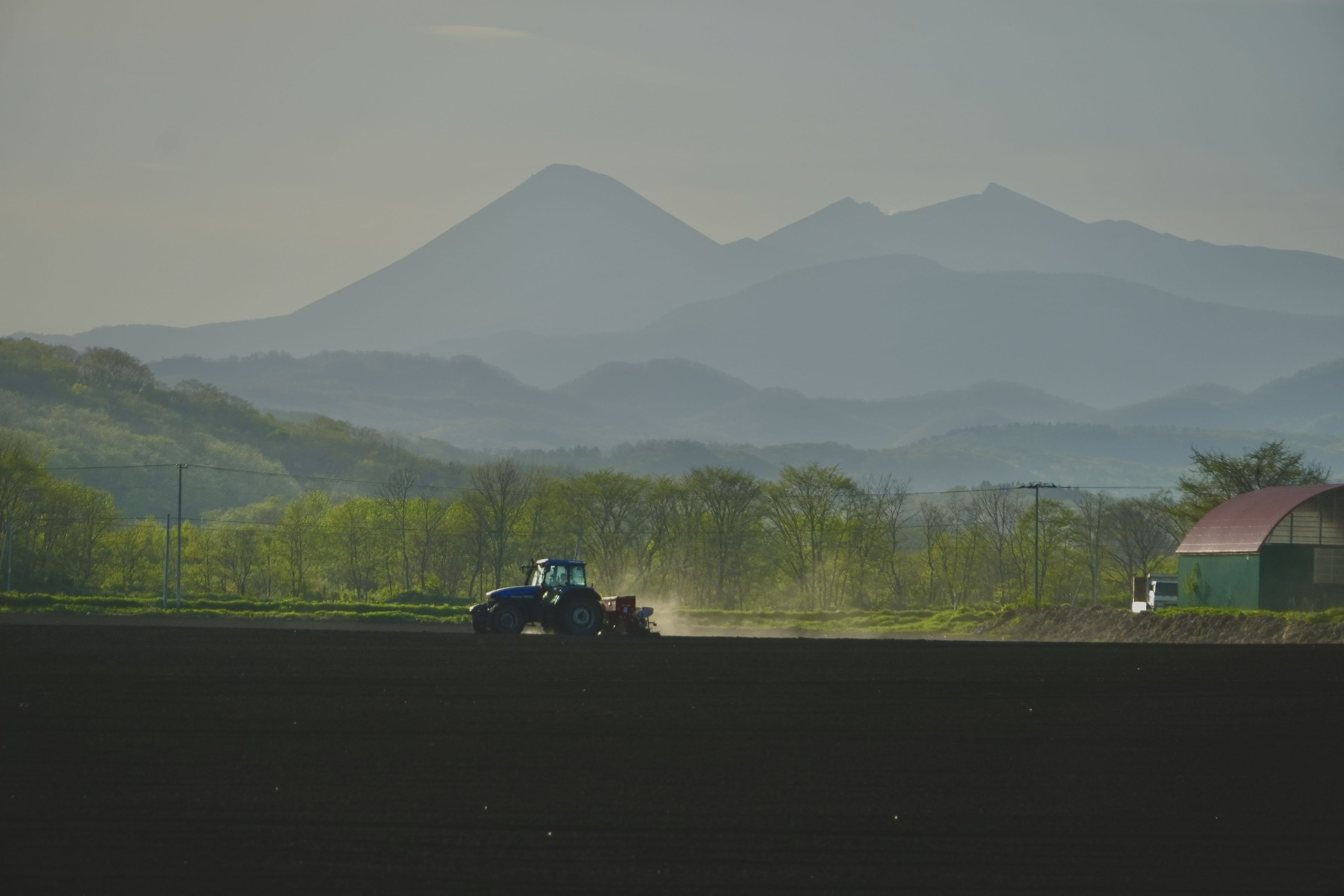 雌阿寒岳が霞んで見えると、まるで水墨画のように見える。 明鏡止水の世界の水墨画と酪農景観は水と油のような関係にあるが、 それが見事に融合している。