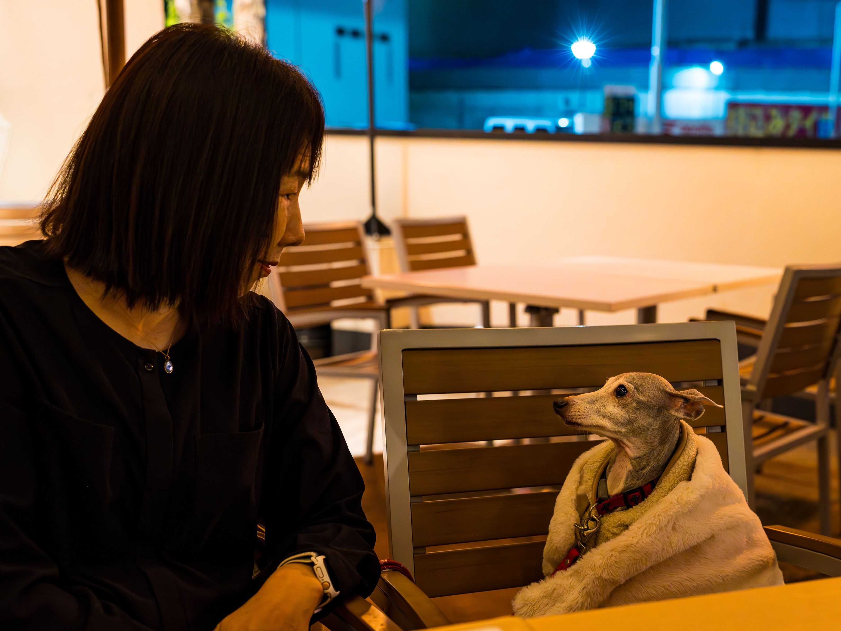イタリアンのテラスで食事中の1ショットです。何かいい感じで見つめ合ってます🎵