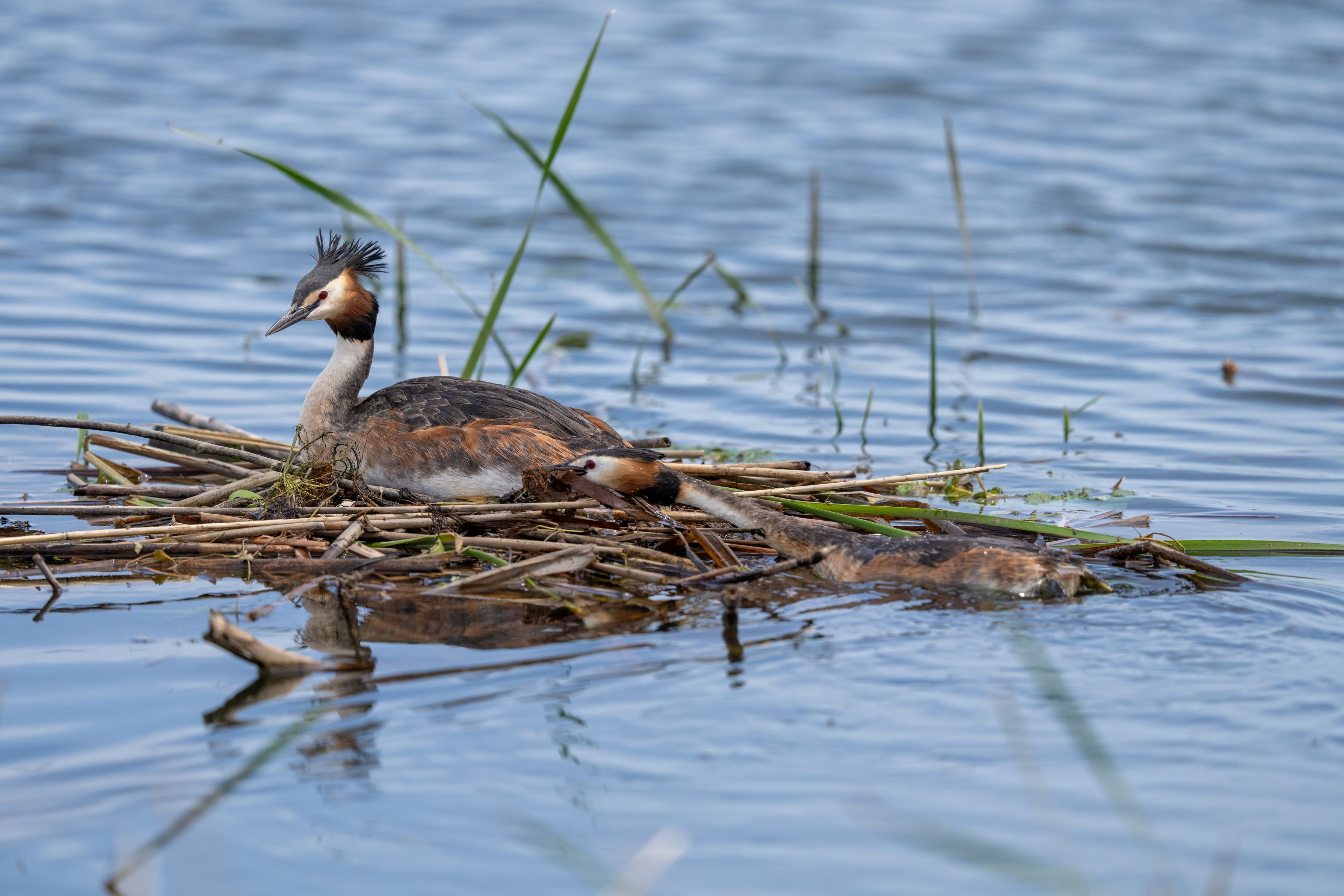 #カンムリカイツブリ#さん宅は只今抱卵中で、夫君がせっせと自宅補強中でした。