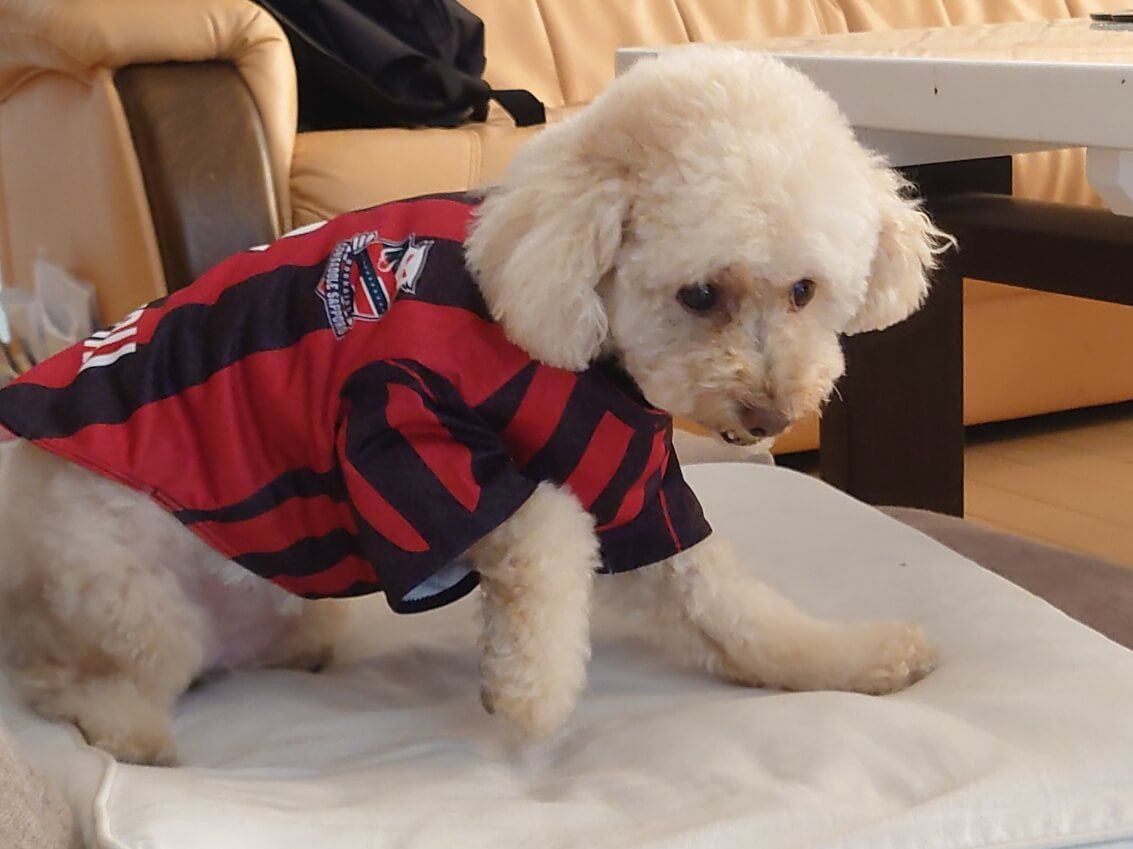#ペット自慢2024_犬# コンサドーレのオフィシャルグッズとして発売されたドッグ用ユニフォームウエアです。 背番号は12番目の選手として「12」です。 NAMURUのネームも入っています。 丈が少し短く、今年も販売予約があったので、1ランク大きいサイズで今度は背番号は「なむる」の名前にちなんで「76」で注文しました。 届くのが楽しみです。